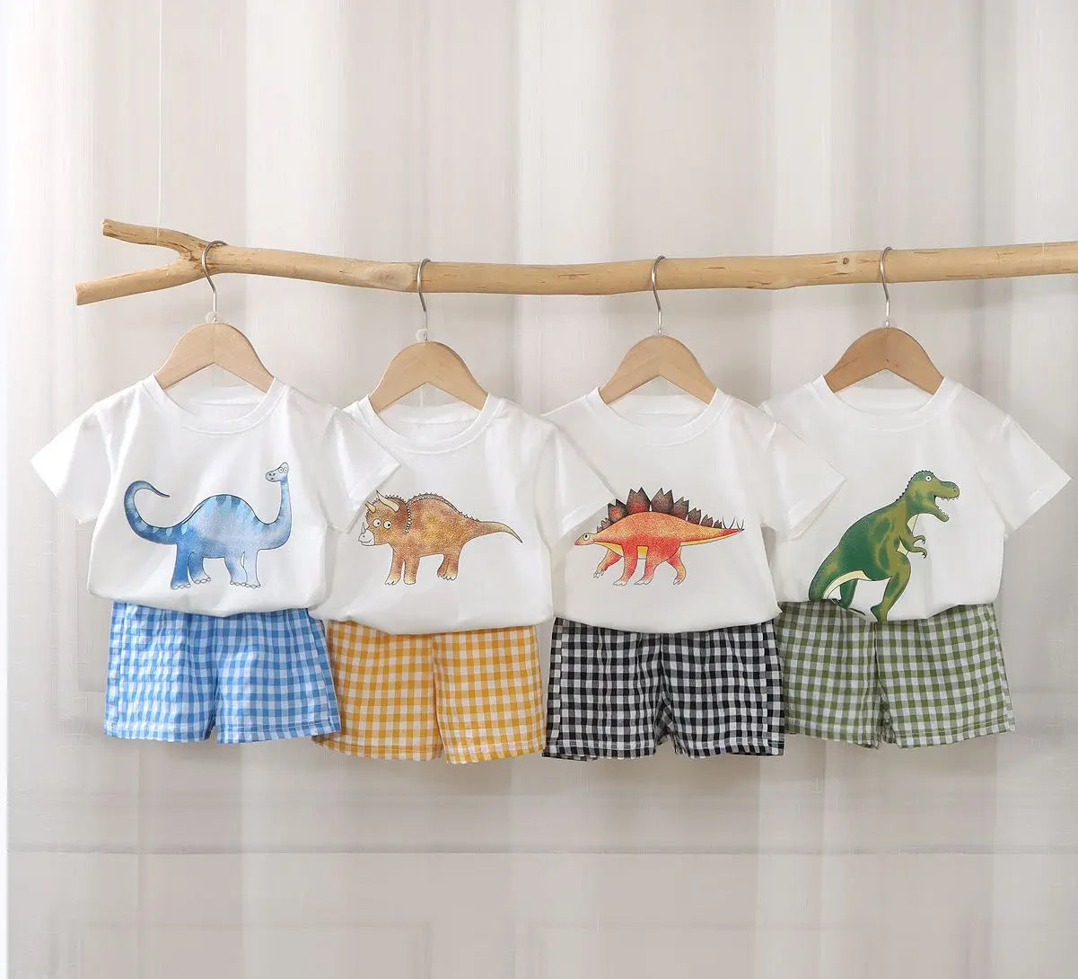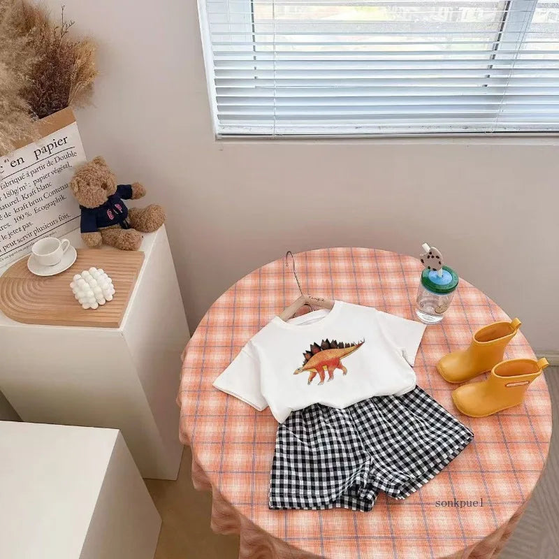2Pcs Baby Clothes Set Newborn Boys Casual Dinosaur Print Short Sleeved T-shirt+plaid Shorts Toddler Girl Summer Kids Outfit Set
