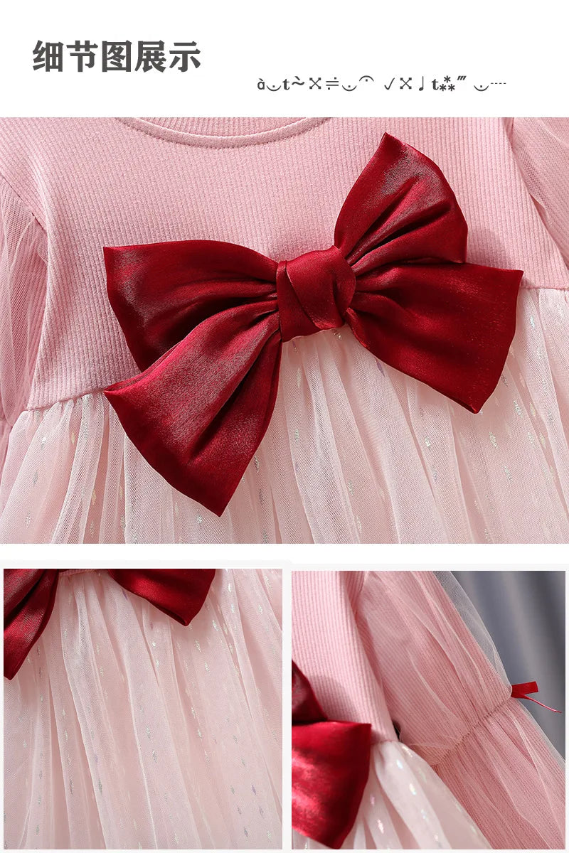 Children's Korean version dress girls' spring and autumn fashion long sleeved bow mesh dress baby's birthday dress 0-4Y