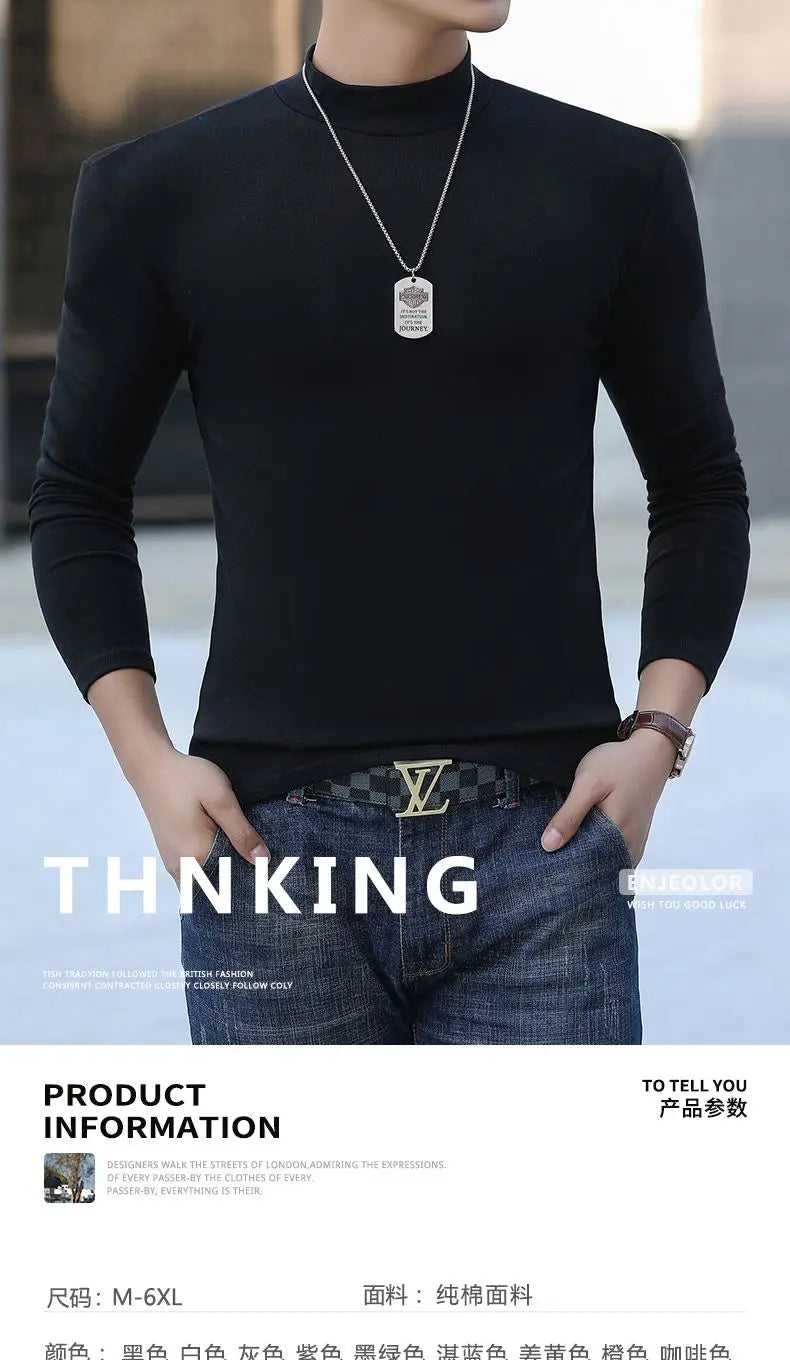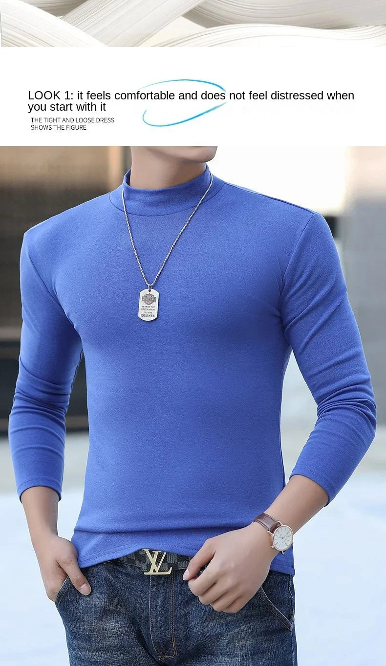 Fashion Men's Oversize High Collar Long Sleeves Autumn Winter Pure Thermal Shirt for Men Layering Stylish T-Shirt
