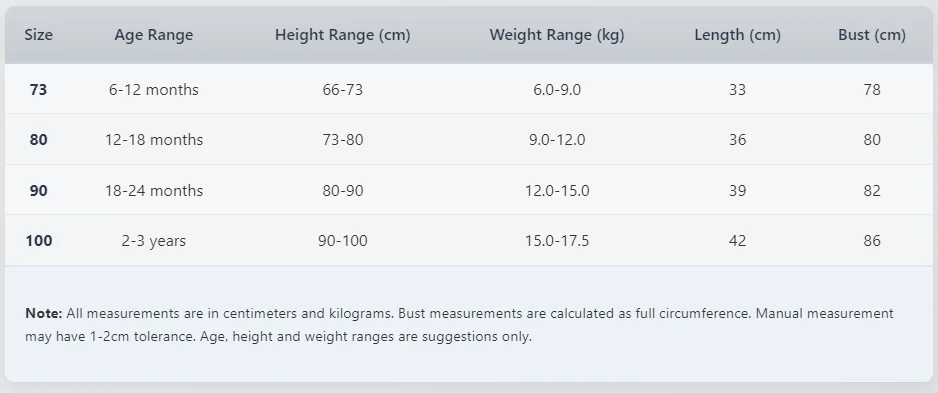 size_info: {"sizeInfoList":[{"length":{"cm":"6–12 months","inch":"6–12 months"},"size":"73","vid":-35},{"length":{"cm":"12–18 months","inch":"12–18 months"},"size":"80","vid":-36},{"length":{"cm":"18–24 months","inch":"18–24 months"},"size":"90","vid":-37},{"length":{"cm":"2–3 years","inch":"2–3 years"},"size":"100","vid":-38}]}