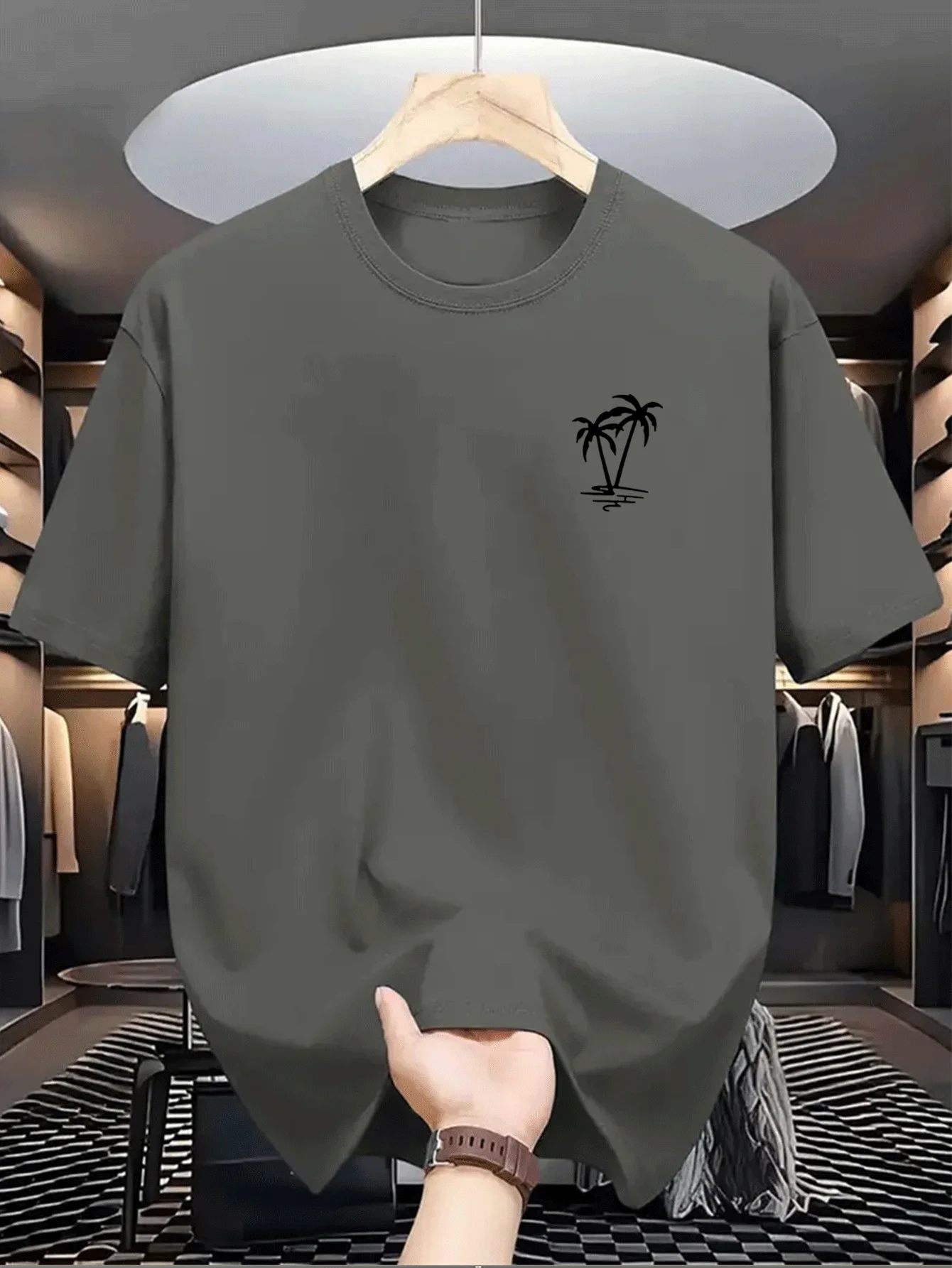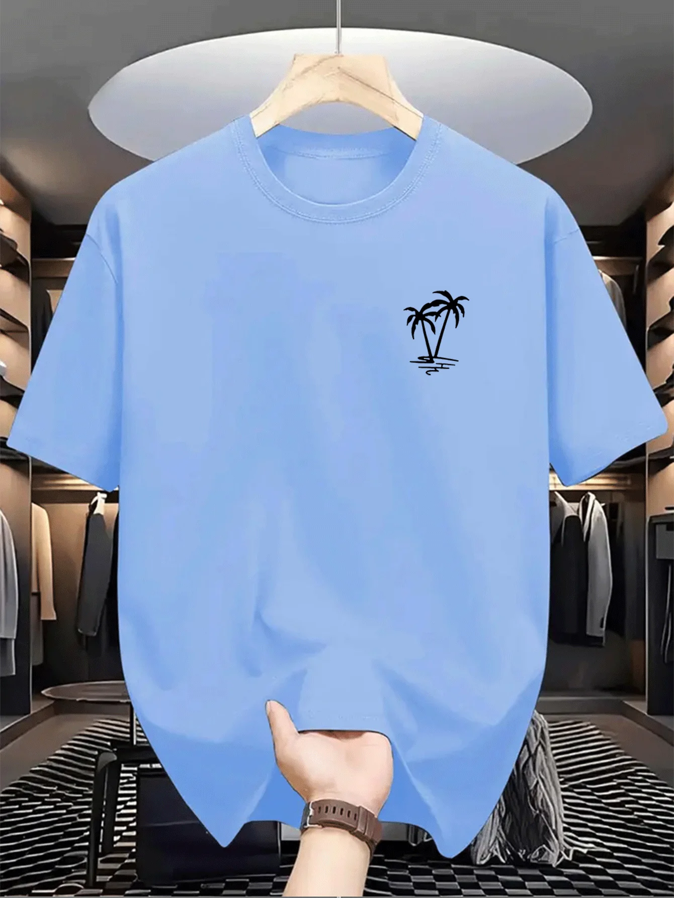 Men's summer cotton fashionable casual loose coconut tree pattern printed sports round neck short sleeved T-shirt top