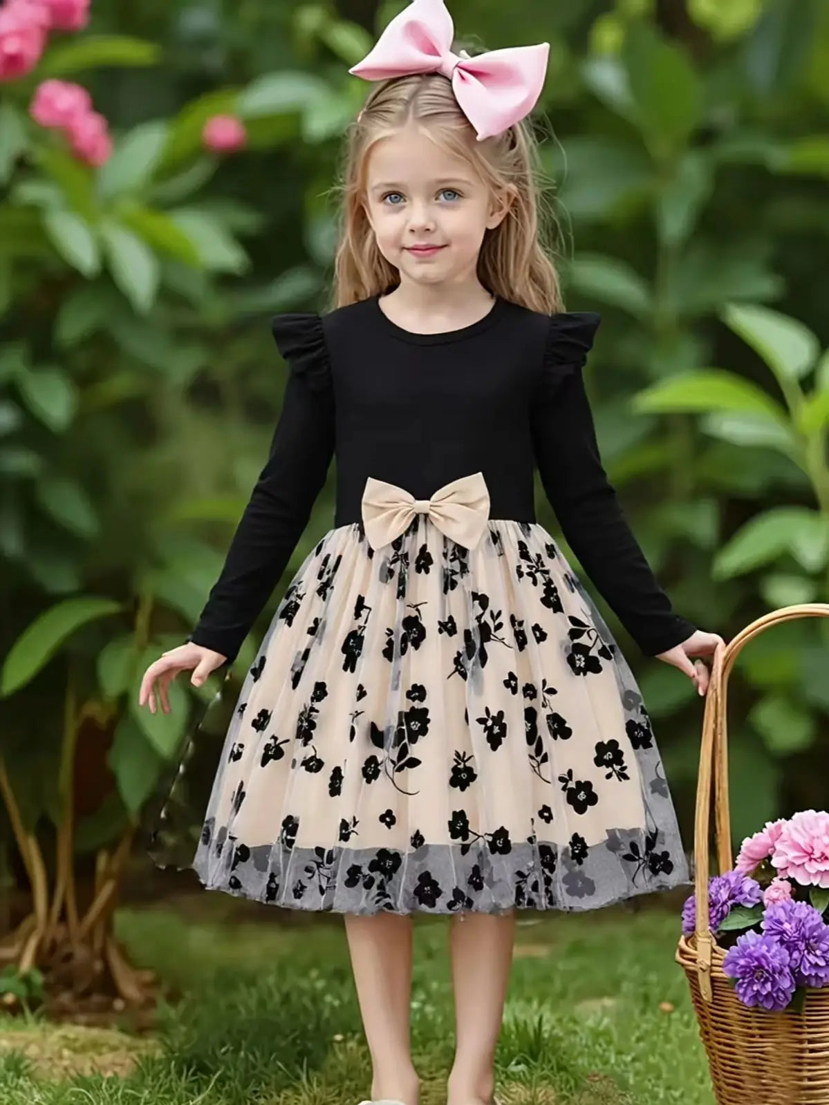 Spring Autumn Infant Toddler Girls round Neck Fly Sleeve Splice Flower Print Tulle Casual Dress for Baby Girls