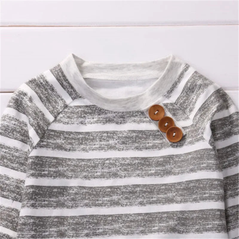 0-18months Baby Boys 3pcs Clothes Set Wide Striped Top Long Drawing Straps Elastic Band Pant Beanie Hat Outfit For Infant Boys