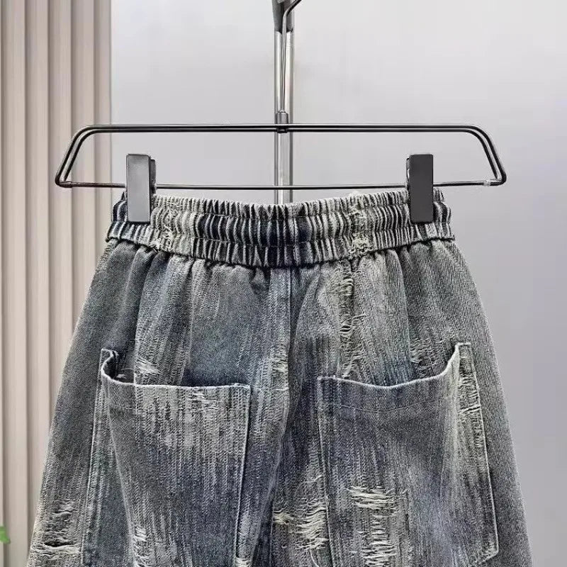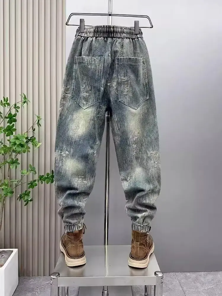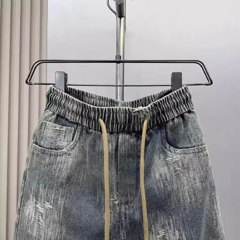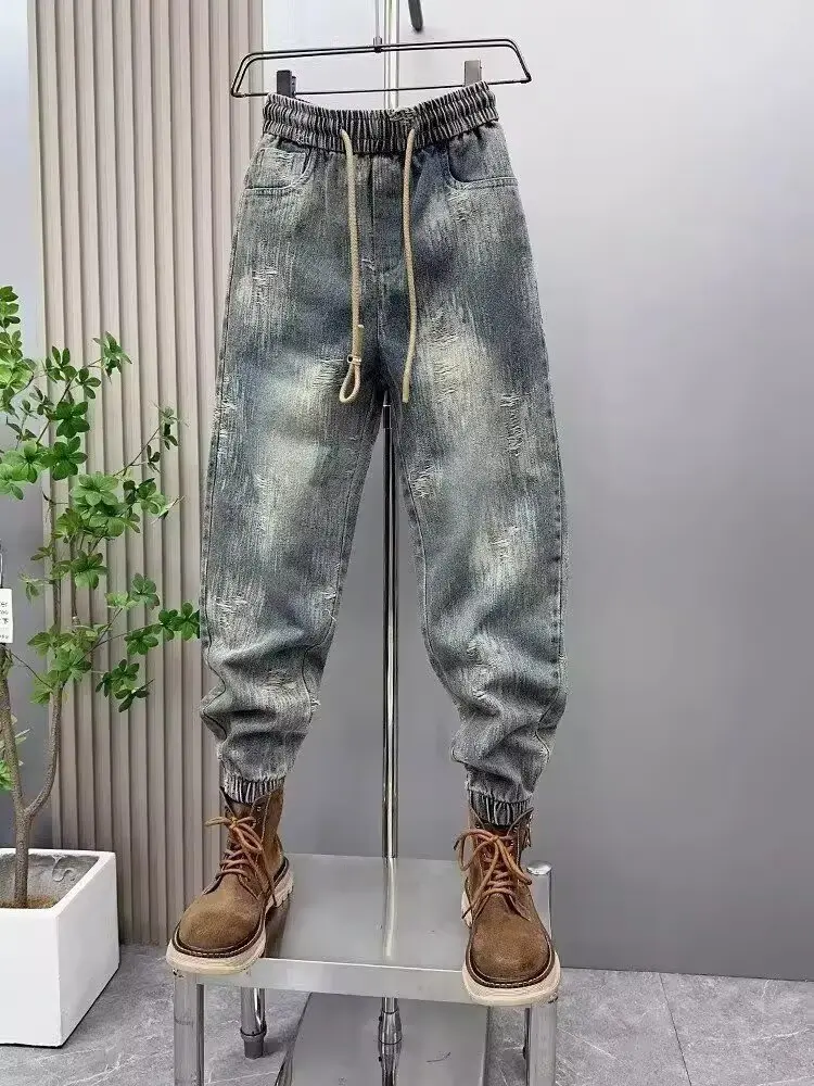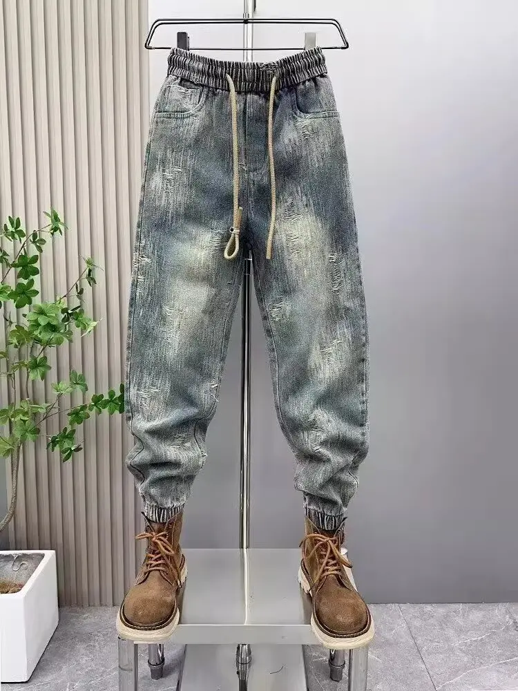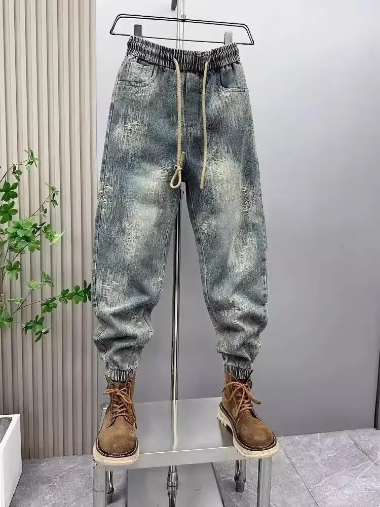 2025 Spring and Autumn Trendy Men's Versatile Cool and Trendy Washed Blue Casual Fashion Drawstring Loose Fit Jeans
