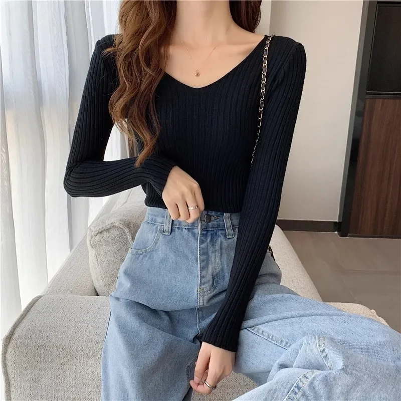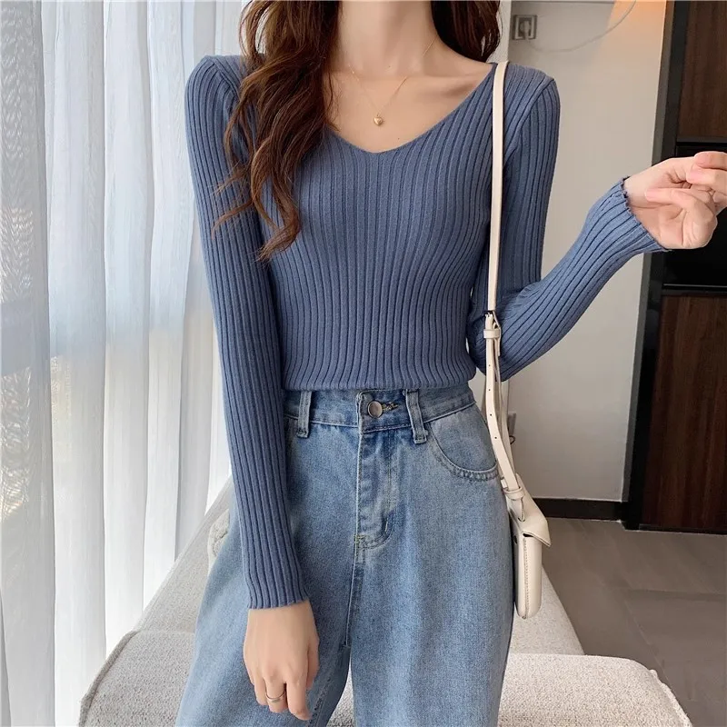 2026 Fashion Casual Long Sleeve Knitted Sweaters Korean Autumn Winter V Neck Sweater Solid Color Slim Pullovers Women Clothes