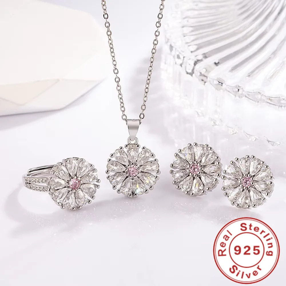925 Sterling Silver Sunflower Zircon Pendant Bracelet Necklace Women's Sterling Silver Jewelry Set Wedding Gift