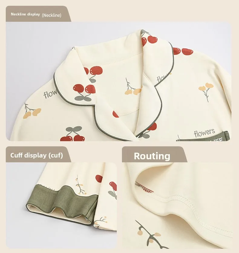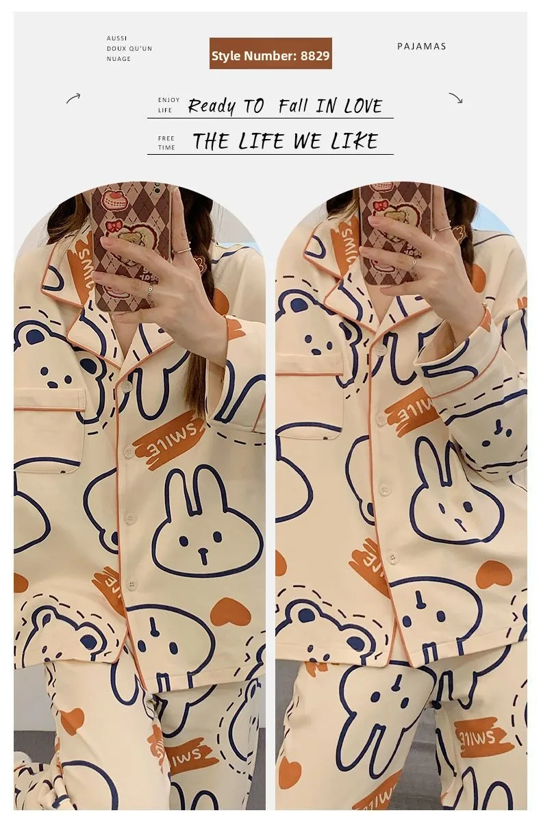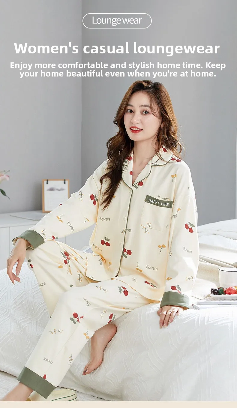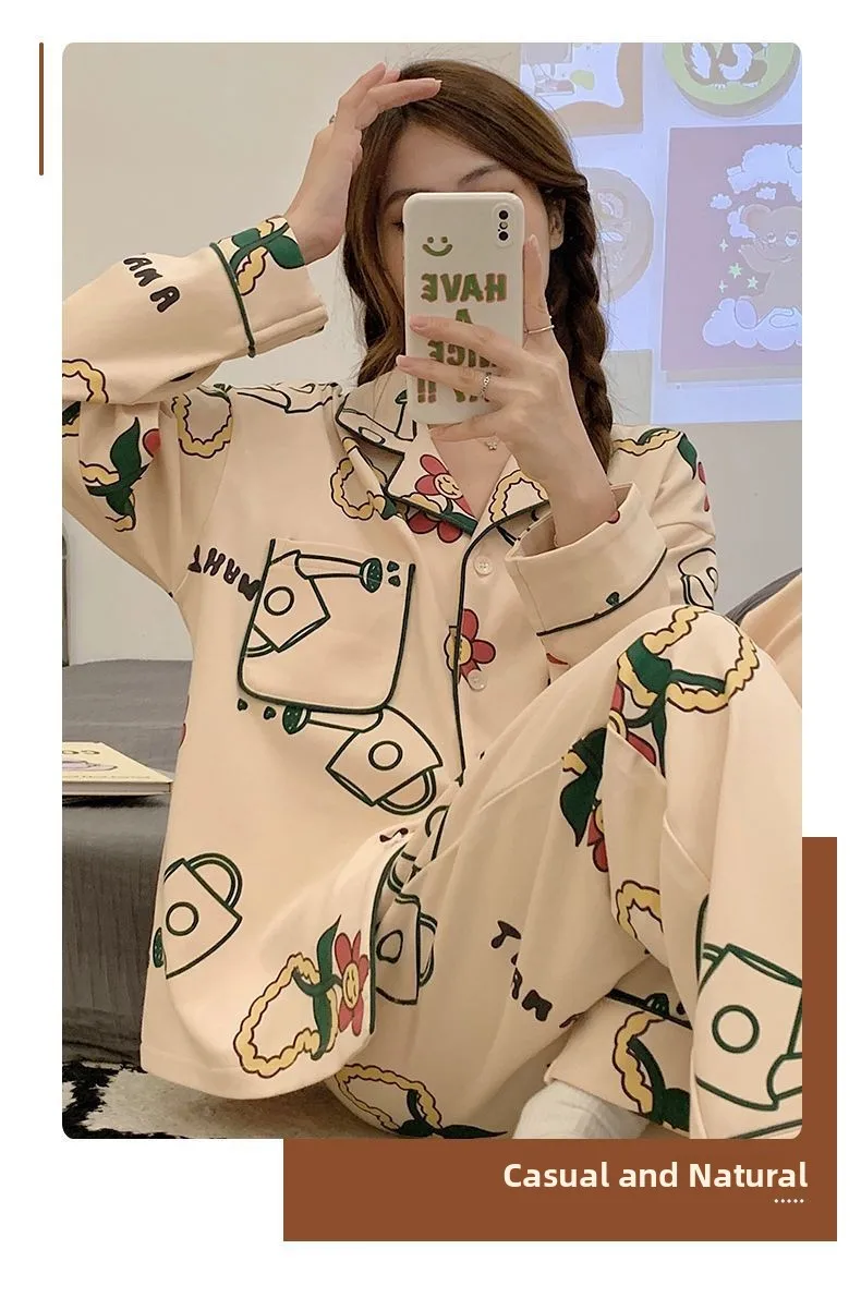 Antibacterial Pure Cotton Sleepwear Set for Women Loose Long Sleeve Home Clothes Cardigan Pants Fashionable Korean Style