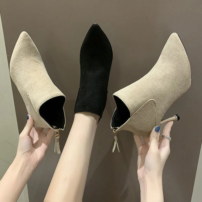 Autumn And Winter New Pointed Toe Thin-heeled Mid-heeled Boots High-heeled Lnternet Celebrity Versatile Short Suede Nude Boots