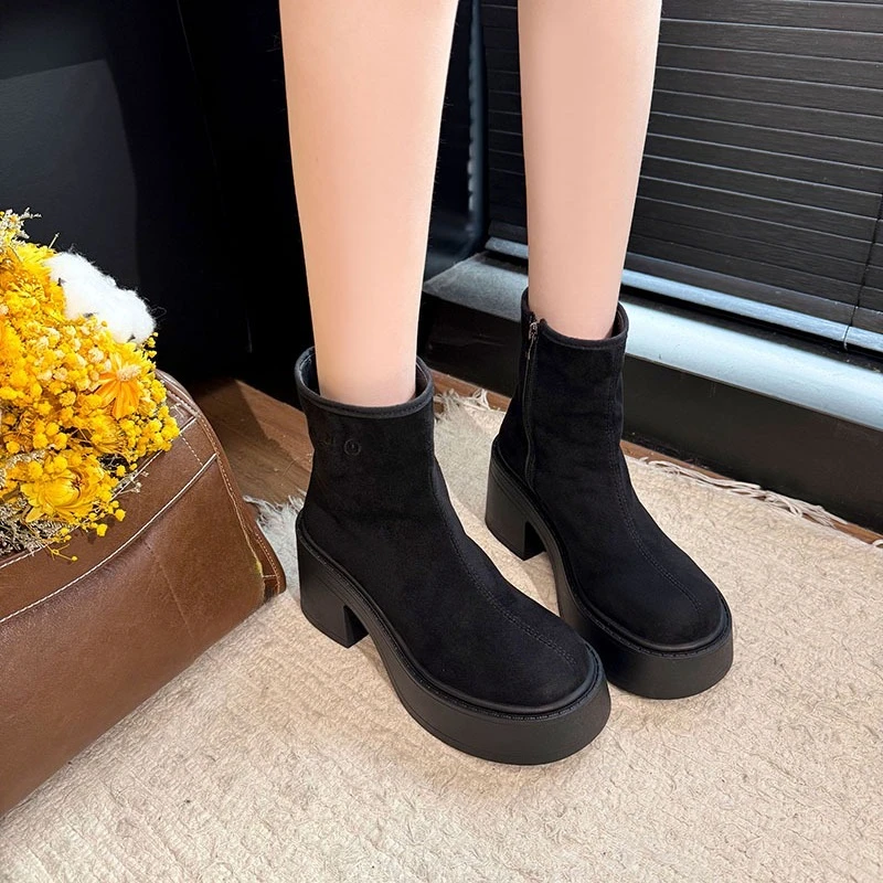 Block Heel Platform Single Boots Autumn New Round Toe Suede Side Zipper Anti-Slip Wear-Resistant Short Boots