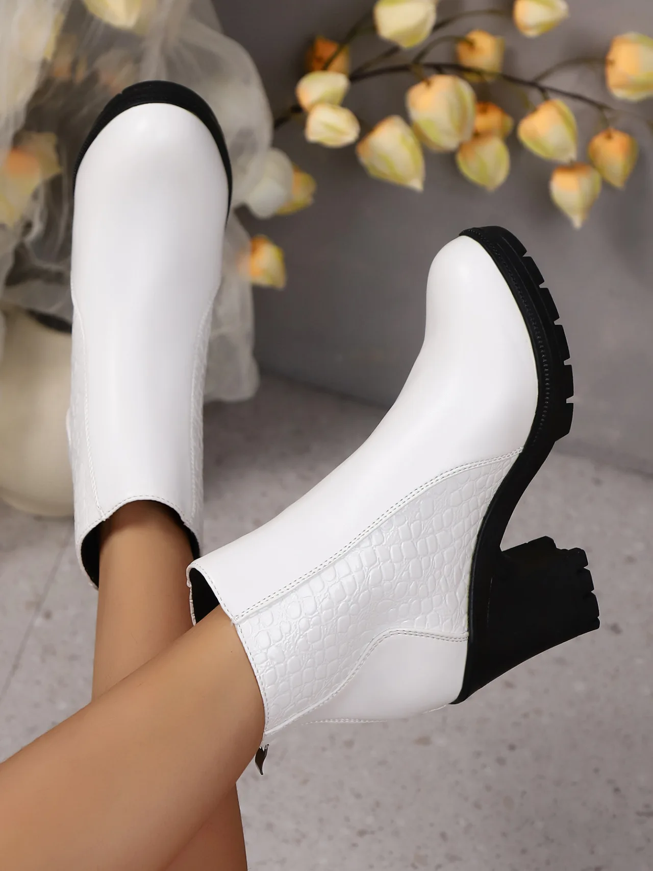 British Style Round Toe High Heel Short Boots for Women Back Zip PU Leather Autumn Winter Ankle Boots Botines Para Mujeres