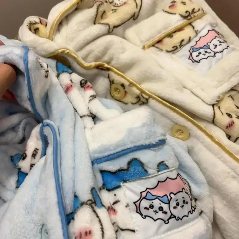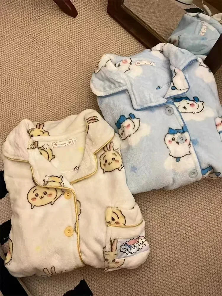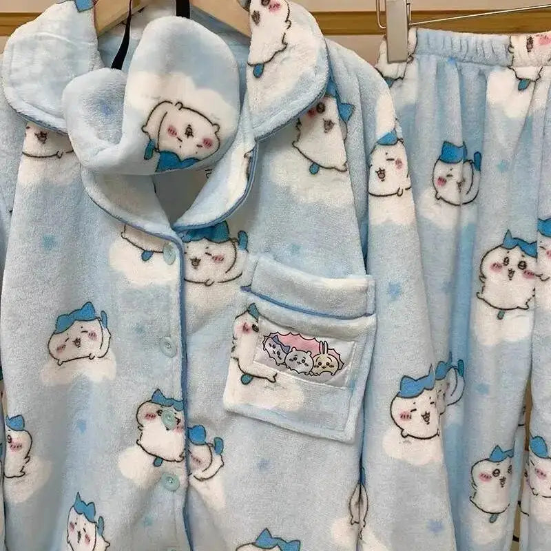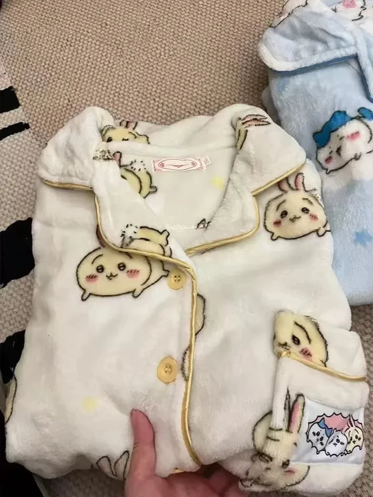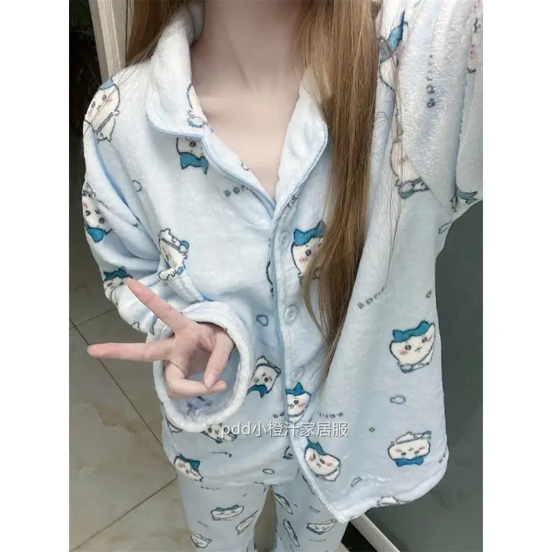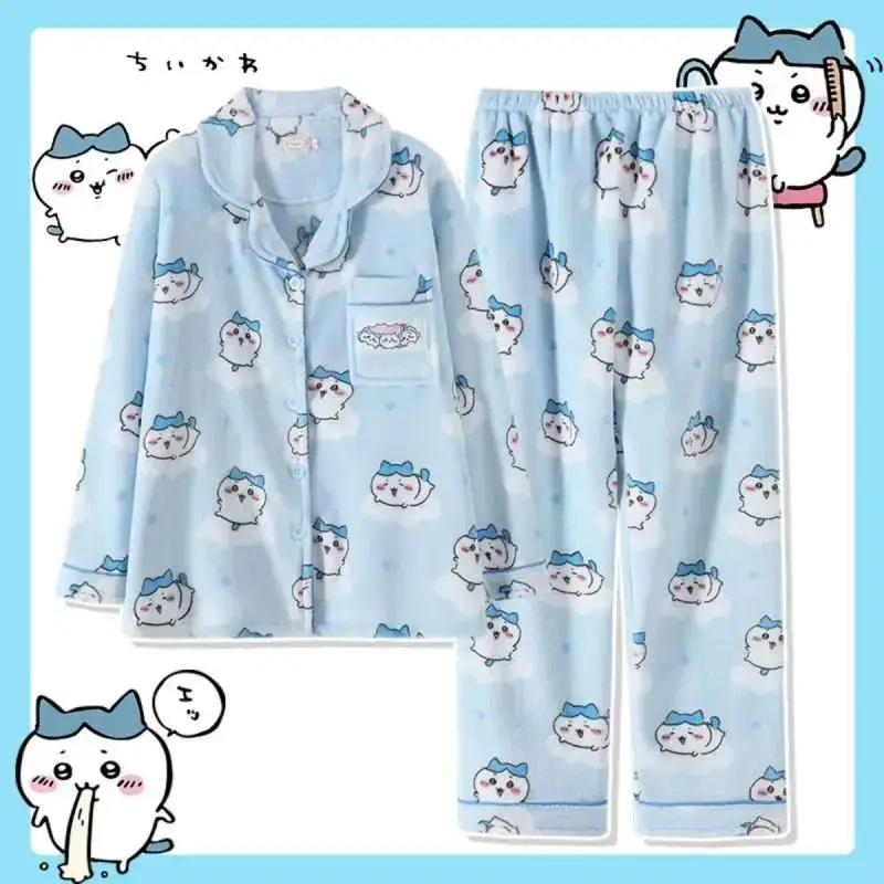 Chikawa Flannel Pjs Thicken Winter Usagi Long Sleeved Pajama Pants Set for Women Plus Velvet Cute Blue Hachiware Home Clothes