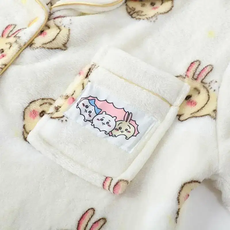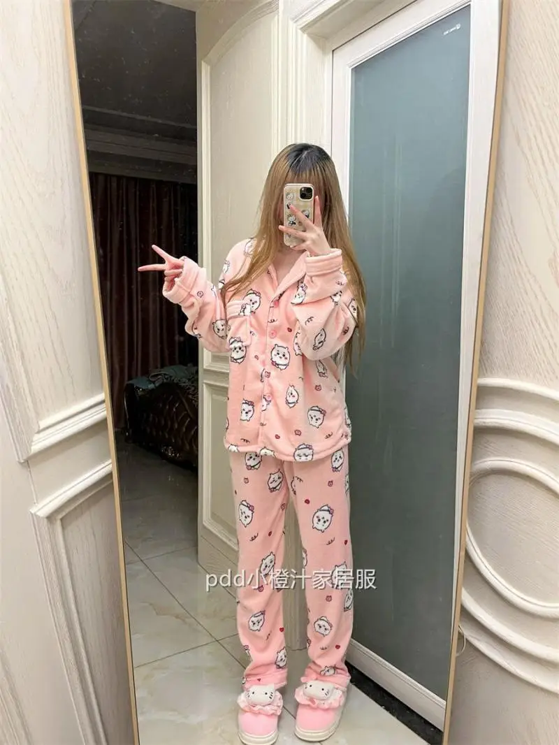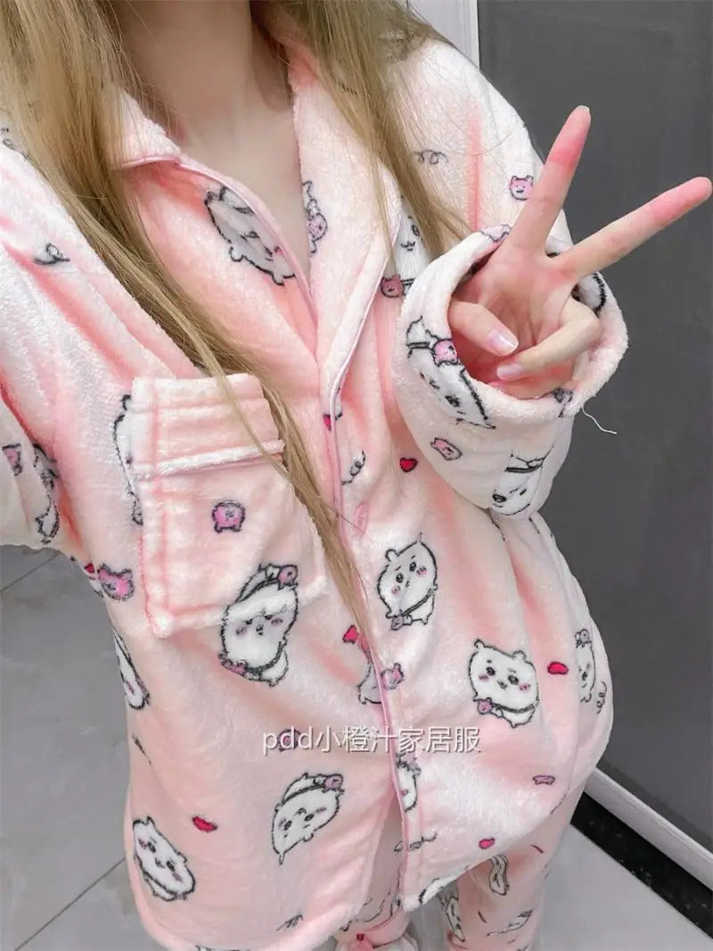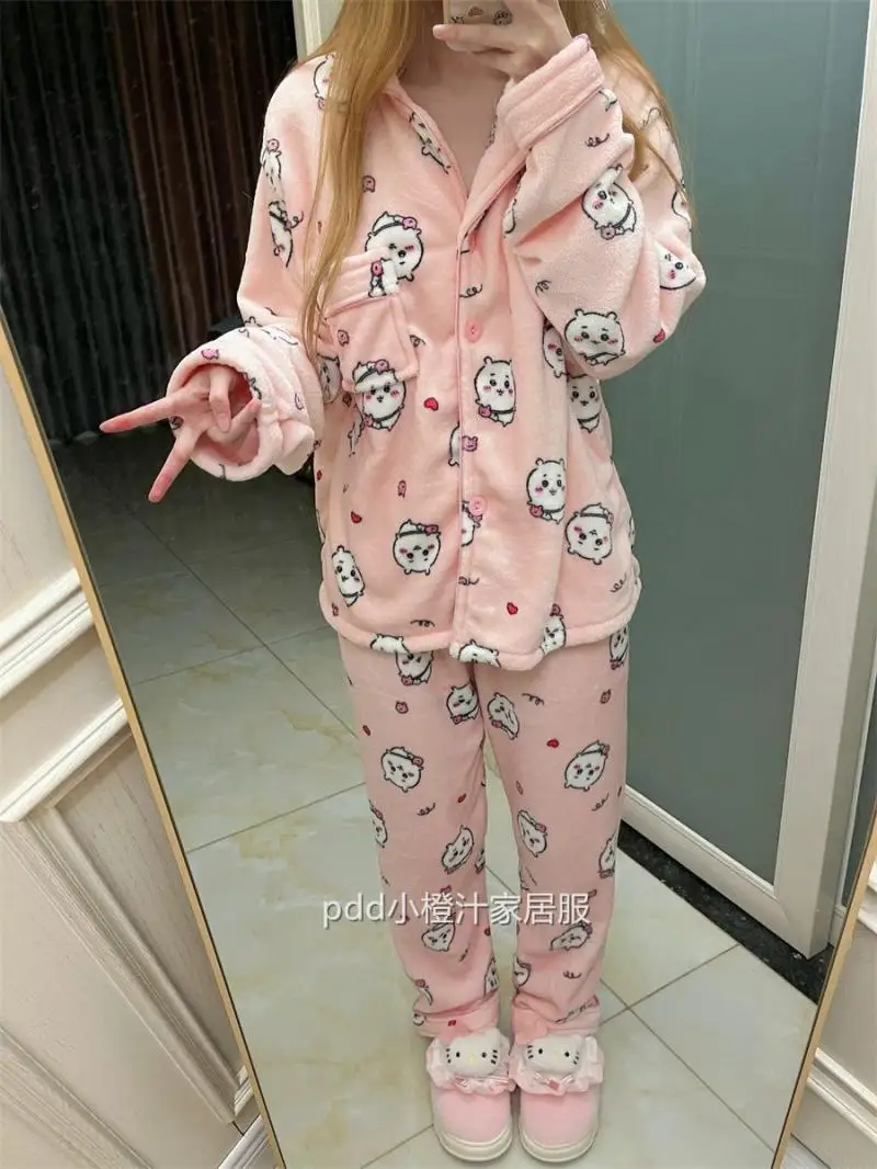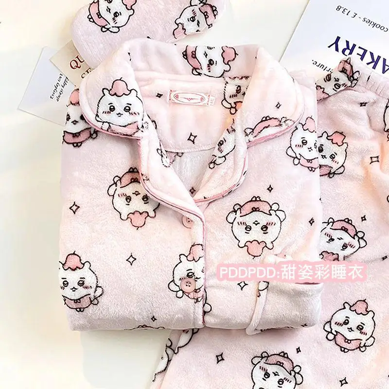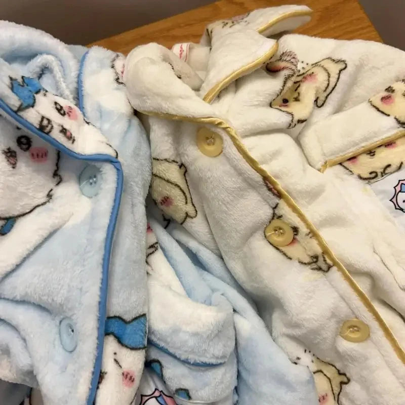 Chikawa Flannel Pjs Thicken Winter Usagi Long Sleeved Pajama Pants Set for Women Plus Velvet Cute Blue Hachiware Home Clothes