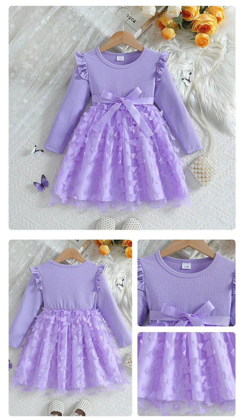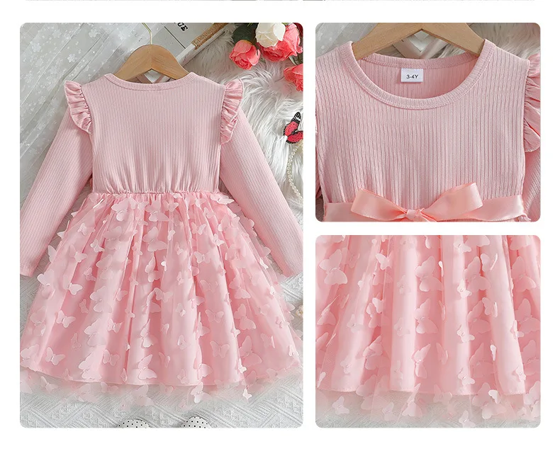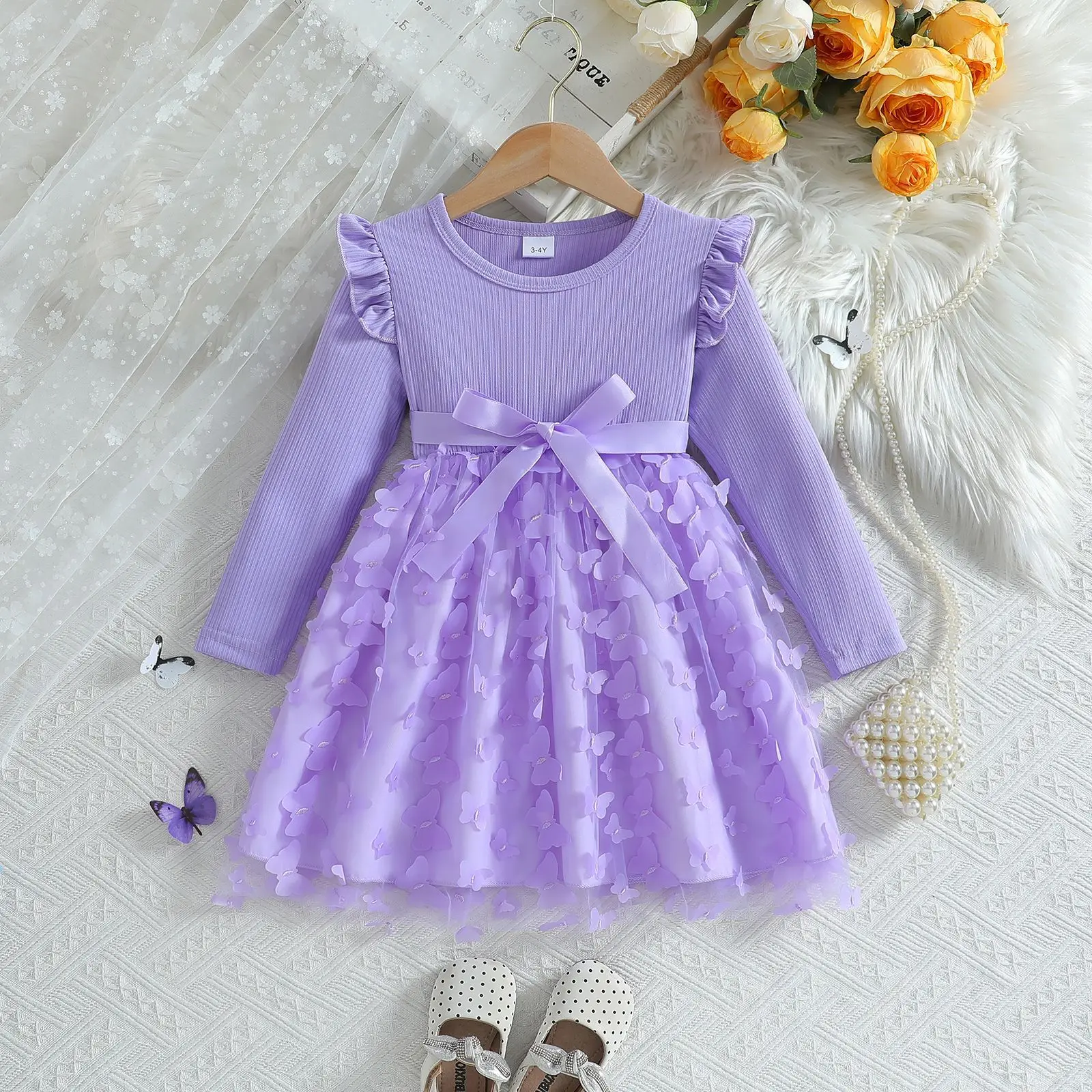 Custom Made Girls' Dresses Girl Three Butterfly Sweet Mesh With Belt Long Sleeved Dress Vestidos De Bebê