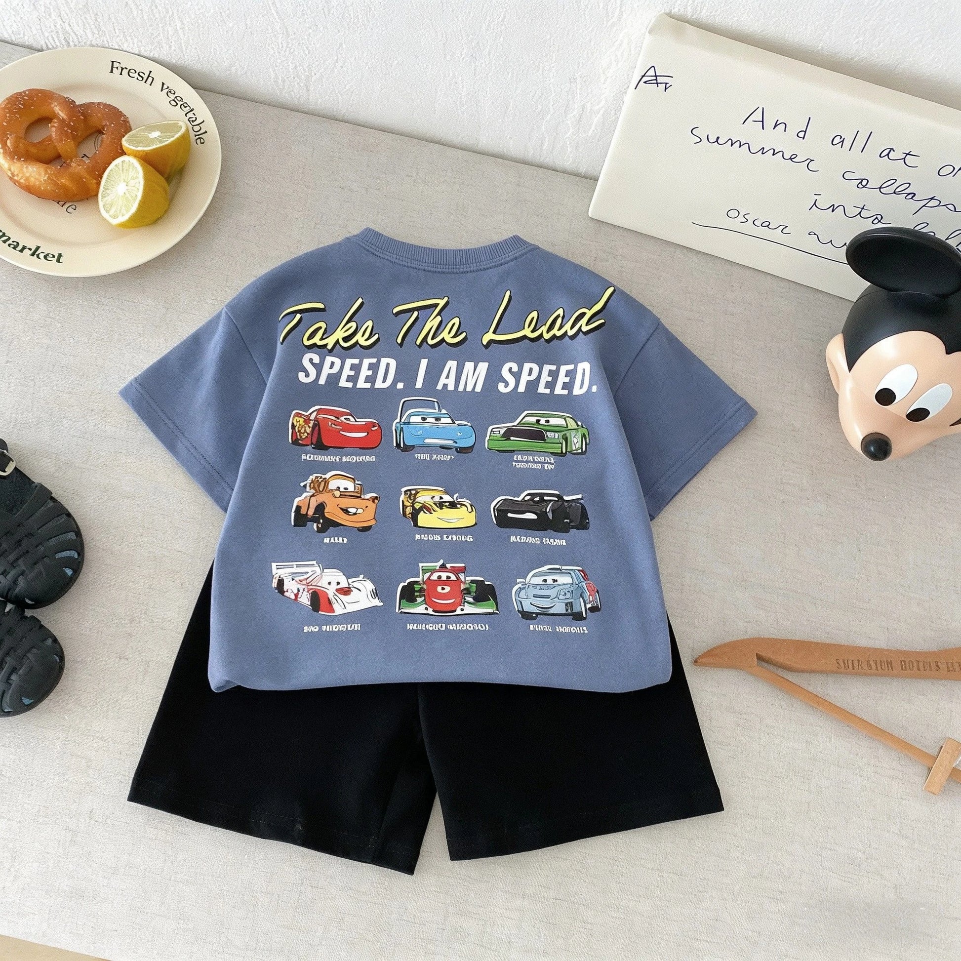 Disney Cartoon Car Fashion Short Sleeve Suit Printed T-shirt Shorts Boys 2pc/set Children's Clothing Summer Casual Tracksuits