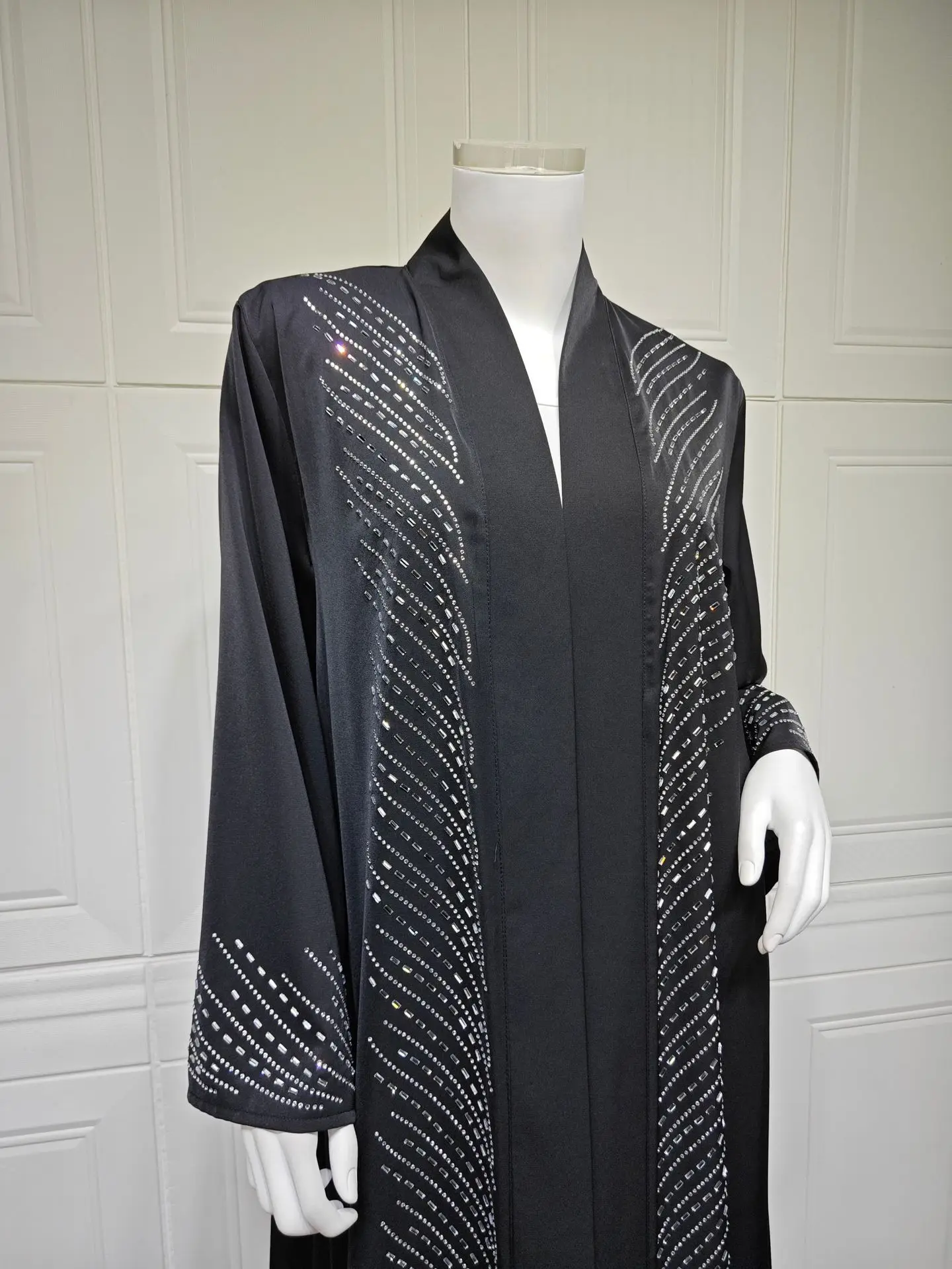 modest Stylish and elegant black cardigan with hot diamonds abaya Dubai women's loose plus-size robe