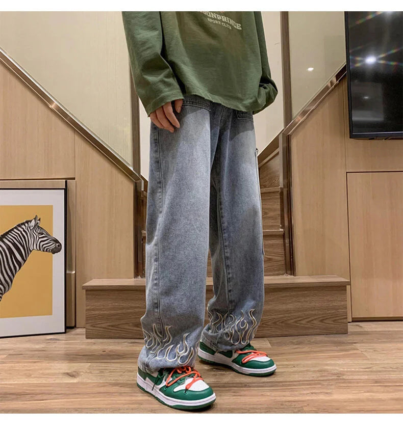 Fashion Flame Embroidery Men's Jeans Neutral Wide Leg Denim Trousers Loose Straight Jeans Youth Casual Baggy Hip Hop Pants 2023