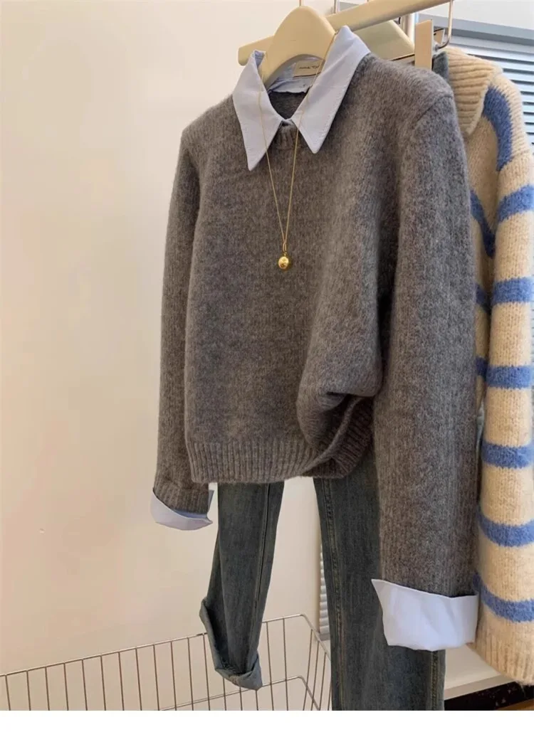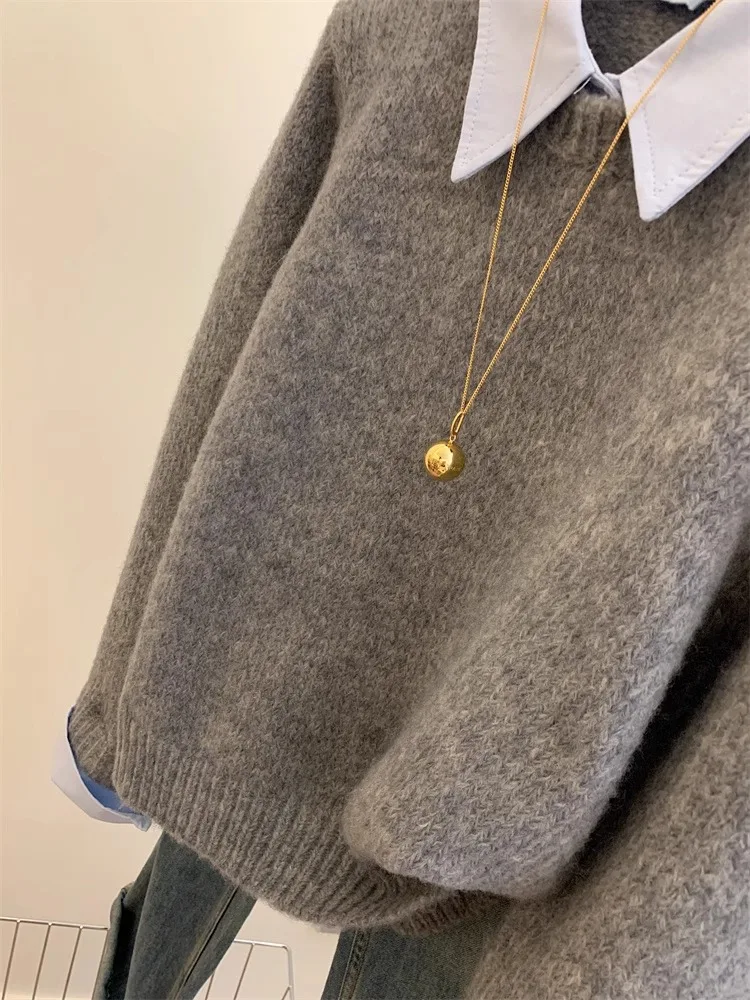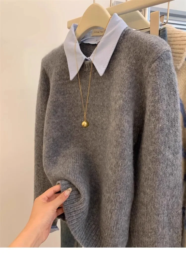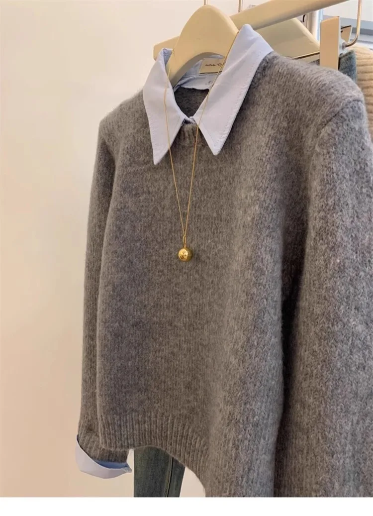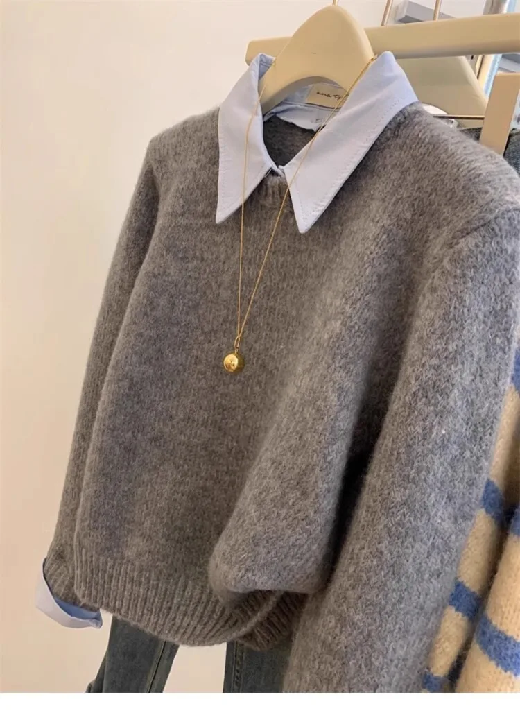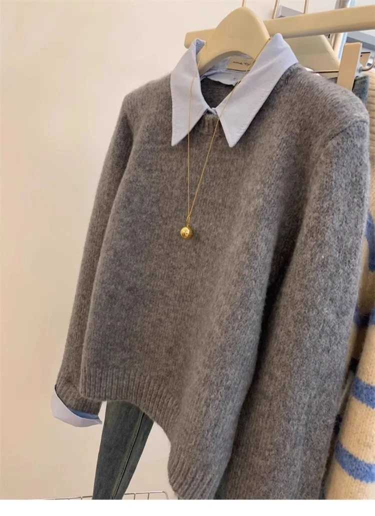 Gray Fake Two-piece Spliced Shirt Collar Sweater 2024 New Autumn/Winter Women's Lazy Style Loose Base Sweater Office Knitted Top