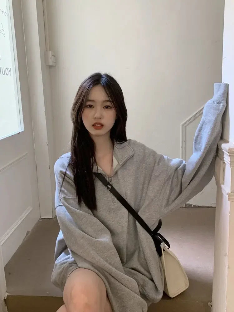 Gray Sweatshirt Women's Loose Polo Collar Lazy Style Autumn Winter New Arrival Missing Bottom Outerwear Long Length Female