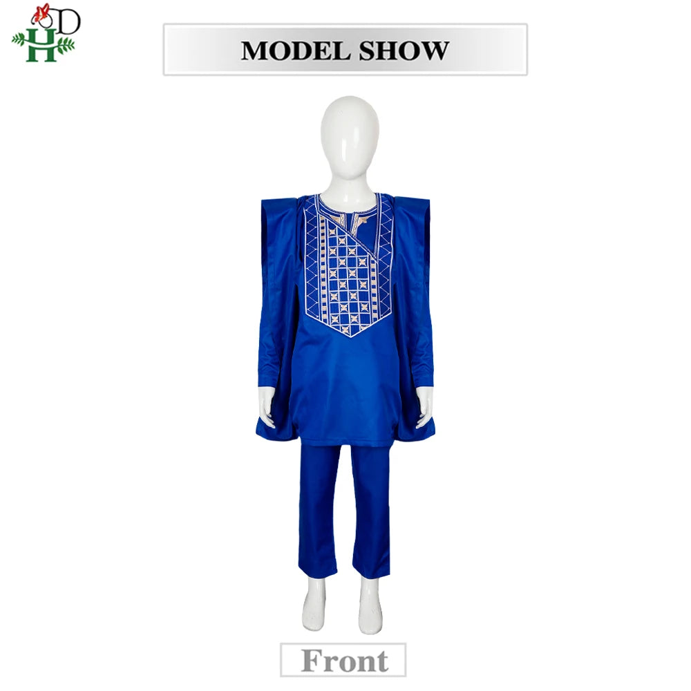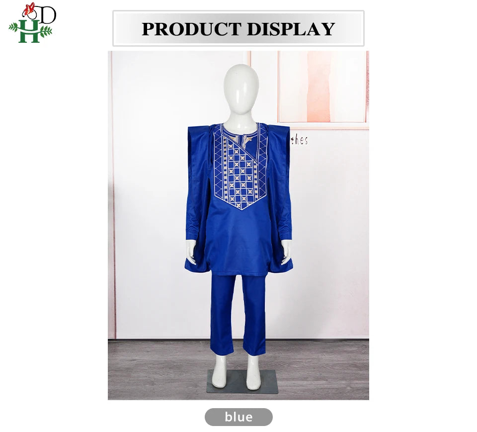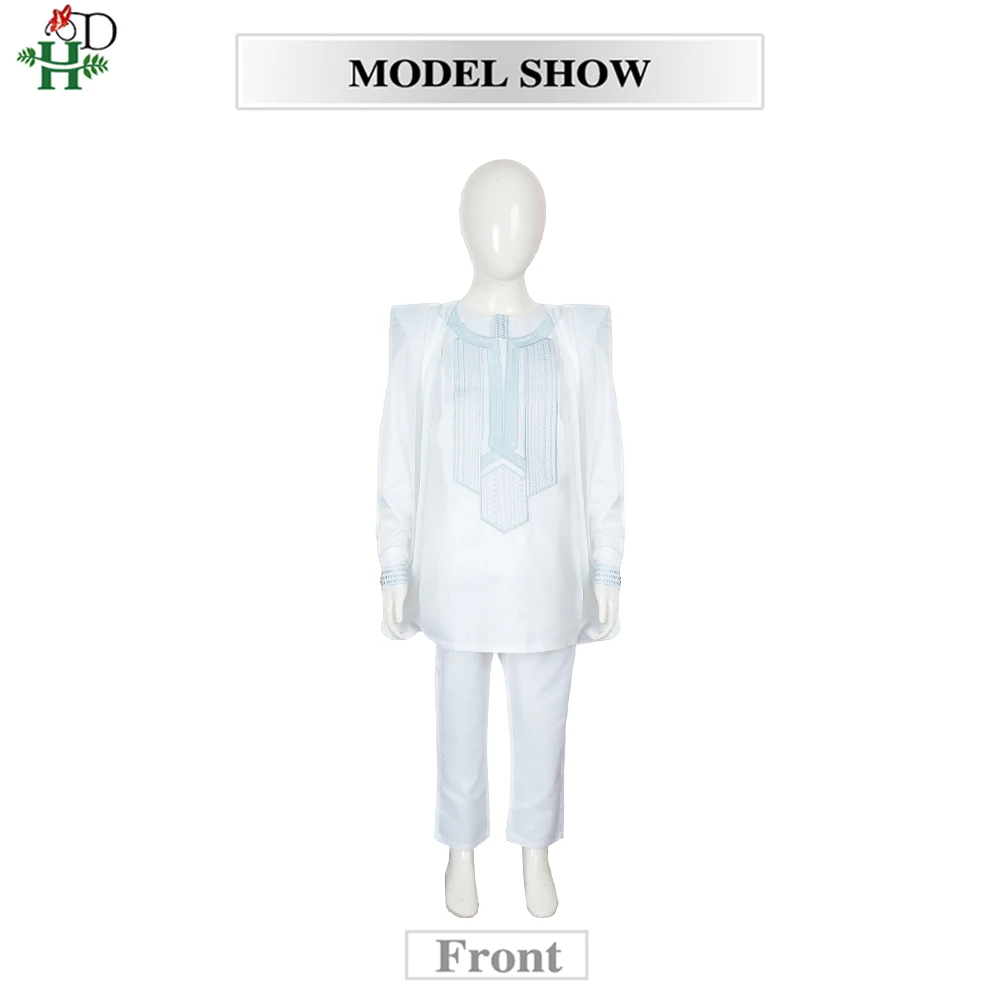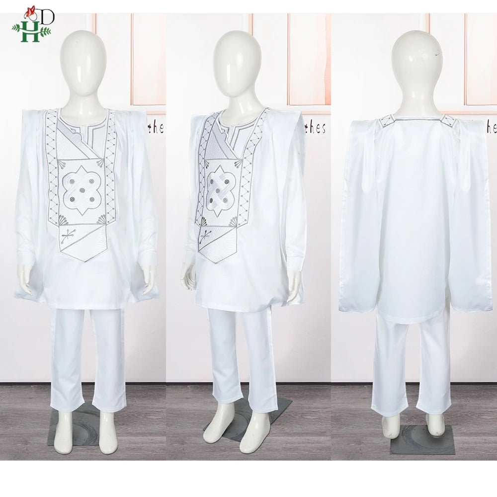 H&D 2025 African Tradition Clothes For Kids Boys White Blue Long Sleeve Tops Embroidery Dashiki Robe Shirt Pant Child Set 3 PCS