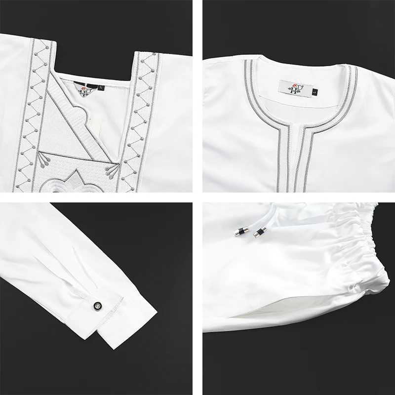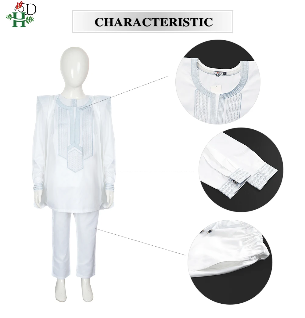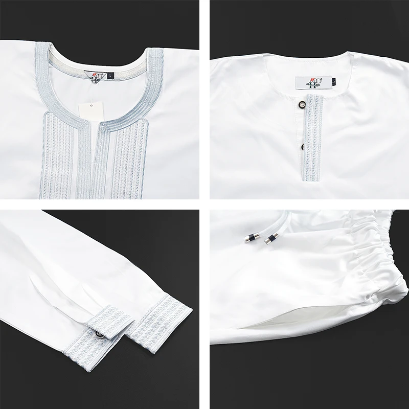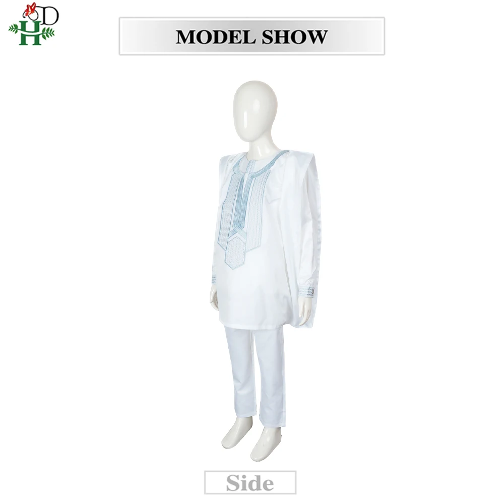 H&D 2025 African Tradition Clothes For Kids Boys White Blue Long Sleeve Tops Embroidery Dashiki Robe Shirt Pant Child Set 3 PCS