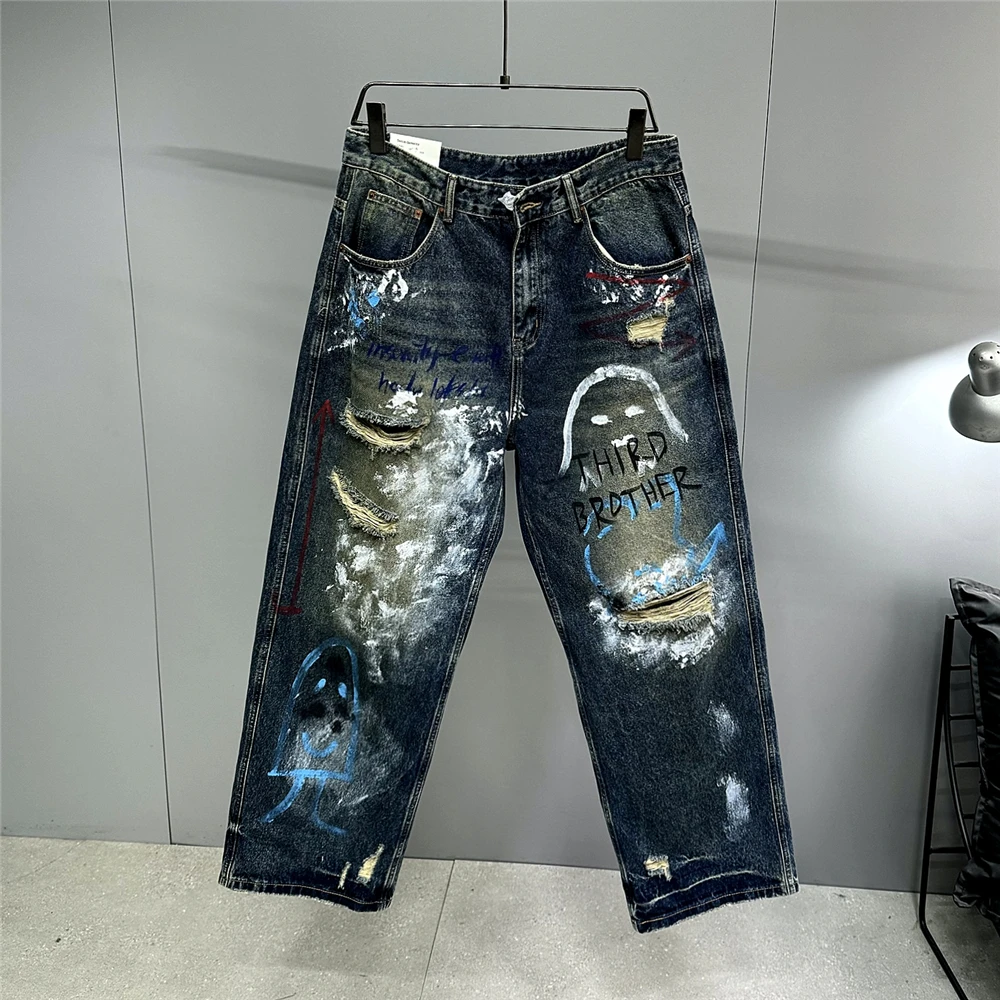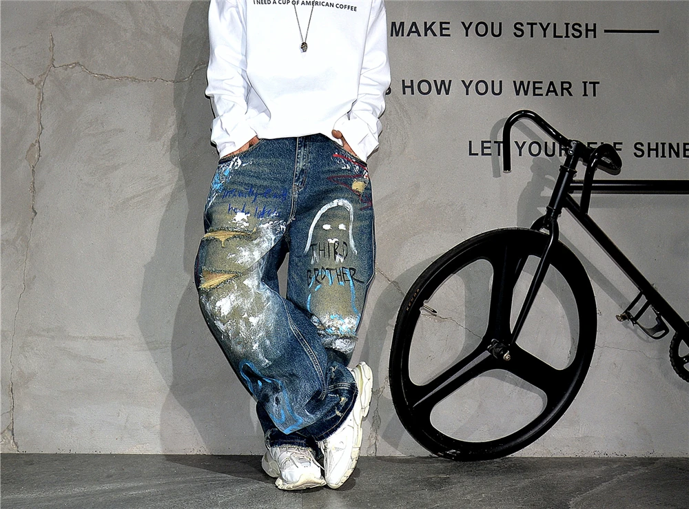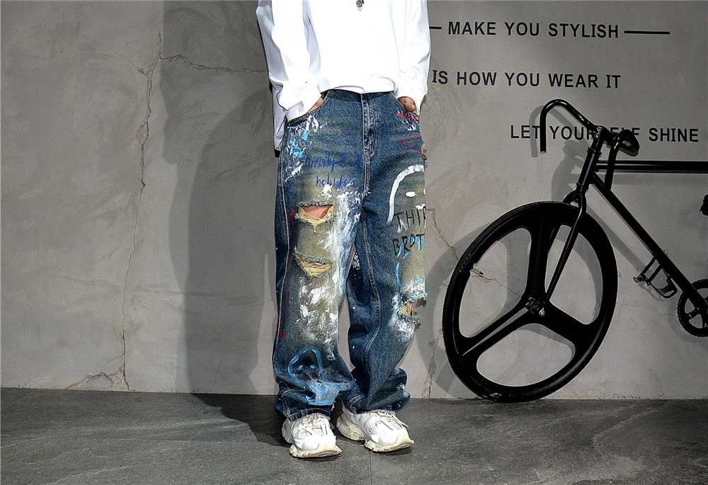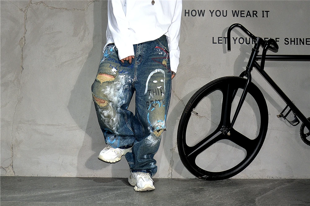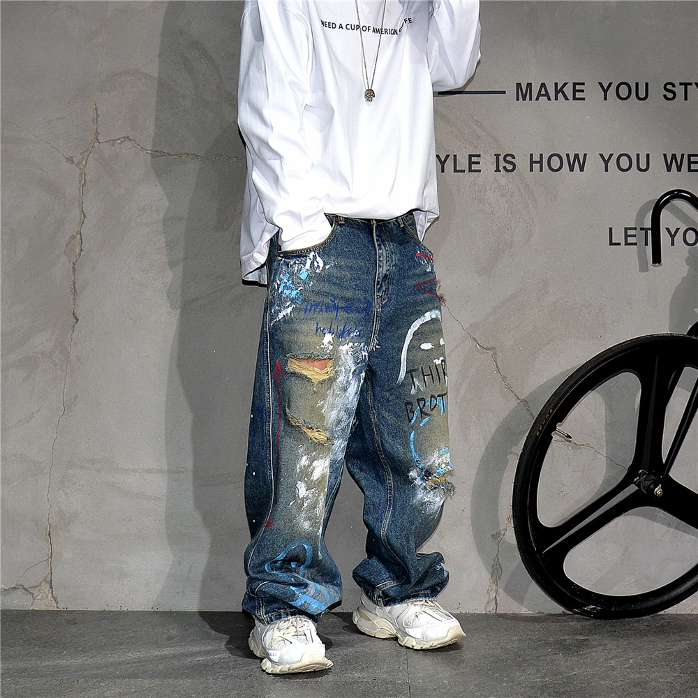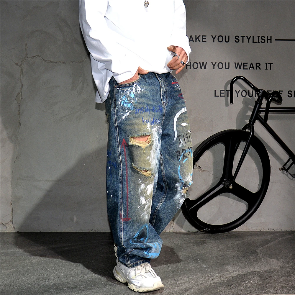 High End Men'S Clothing Hip Hop Graffiti Baggy Jeans For Men Streetwear Skateboard Ripped Jeans Korean Trendy Denim Trousers