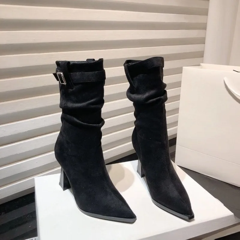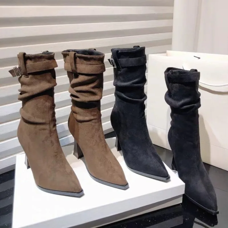 High Heeled Single Boots Women's Fashion Pointed Toe Suede Metal Buckle Anti-slip Wear-resistant Mid-leg Boots