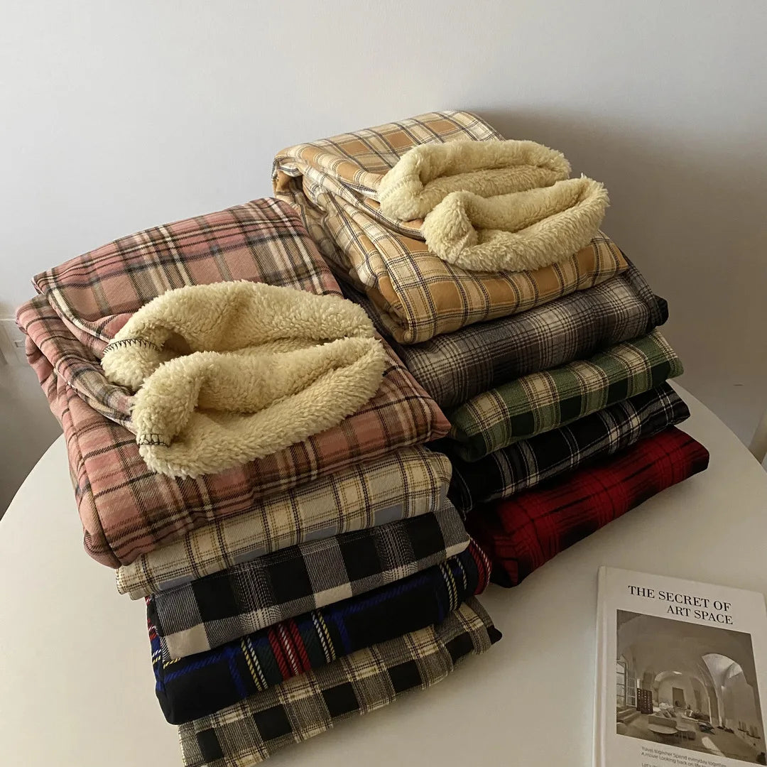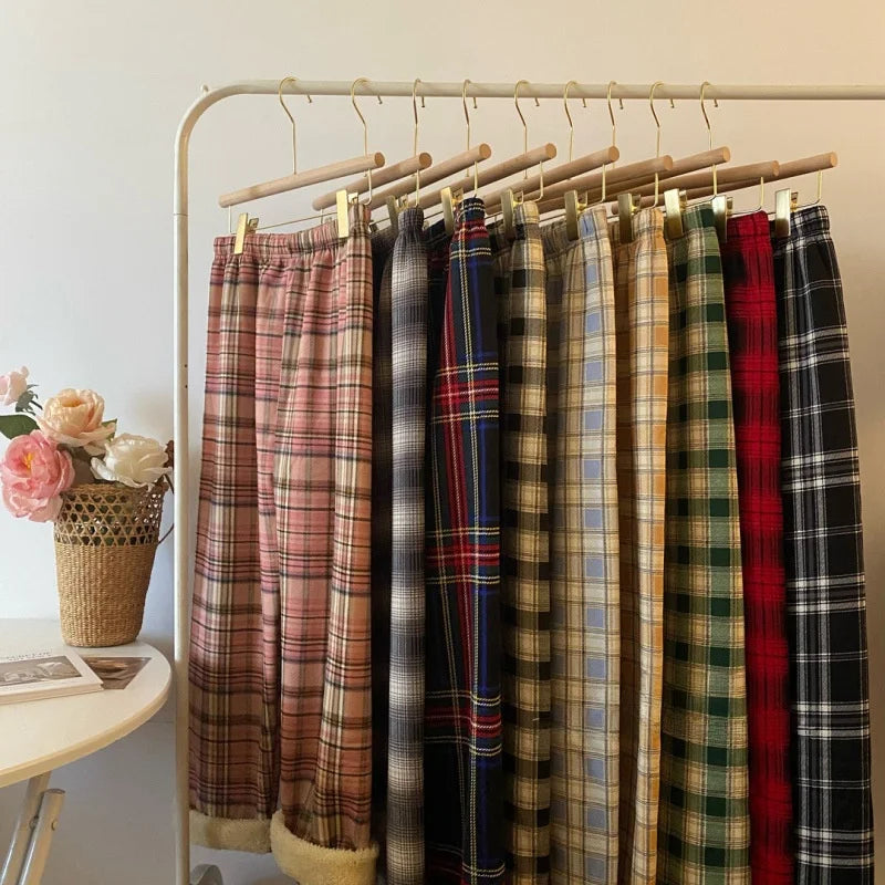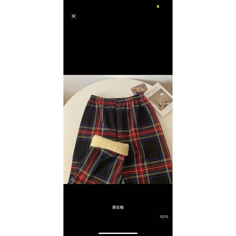 High Waist Straight Leg Pants Women's Autumn Winter Thickened Fleece Lamb Velvet Plaid Pants Loose Wide Leg Casual Trousers