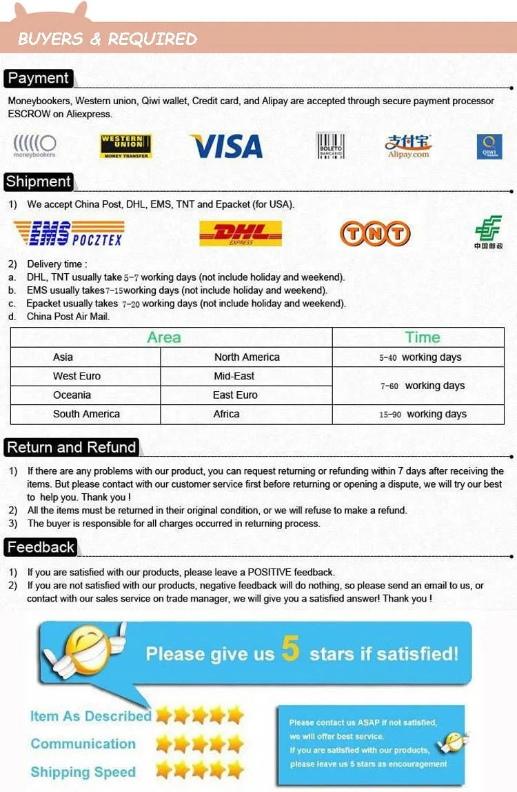 5.For shipping days, we cannot guarantee the delivery timeframe if the post office has any unexpected delays due to holiday, weather, customs, or other conditions.