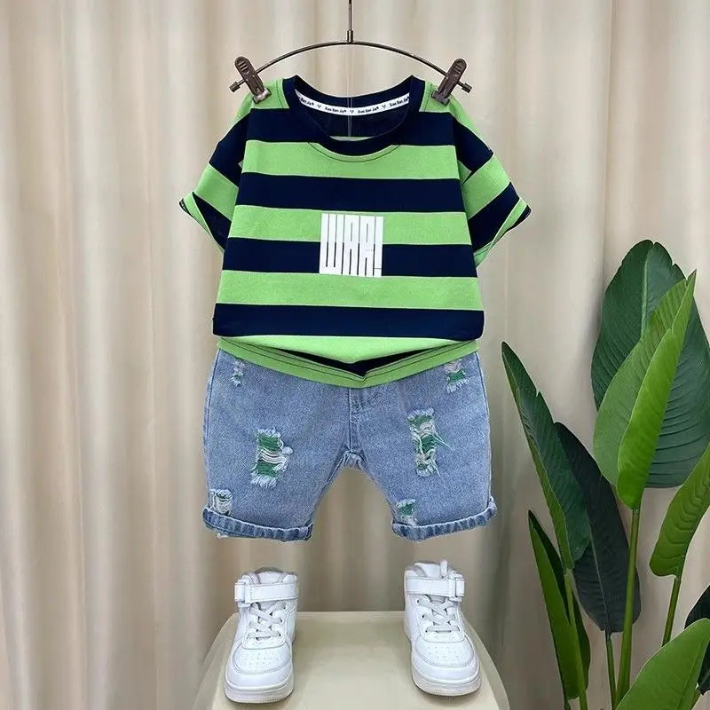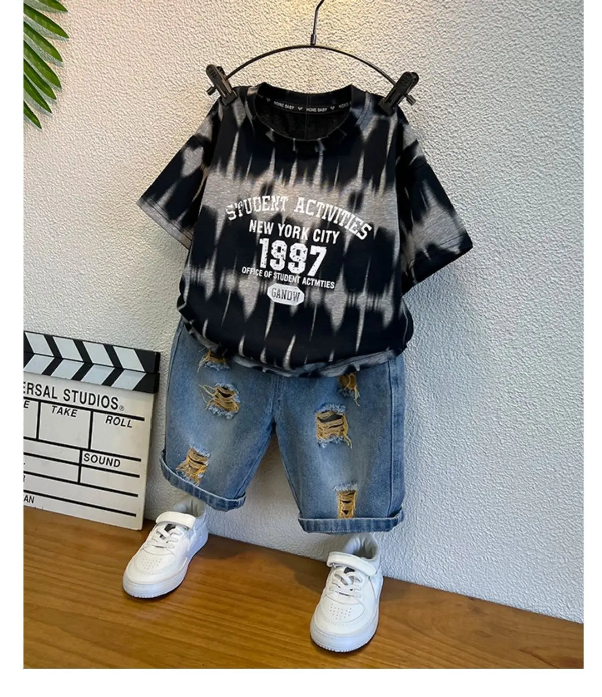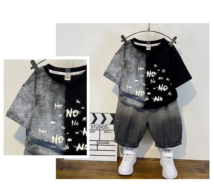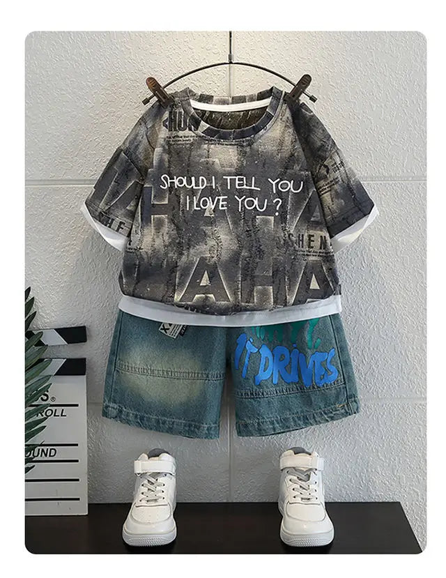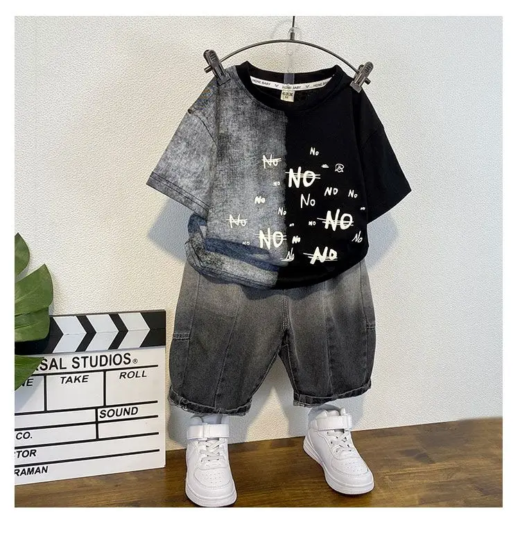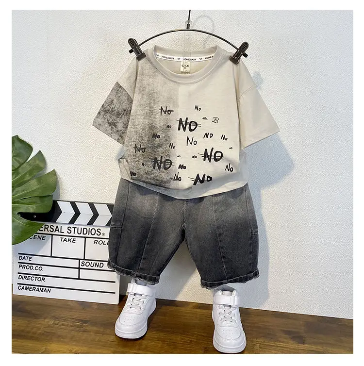 Korean Baby Boys Summer Sets Children's Clothing Short-Sleeved Letter T-Shirt & Denim Shorts Kids Boys Outfits Clothes 2-11Y