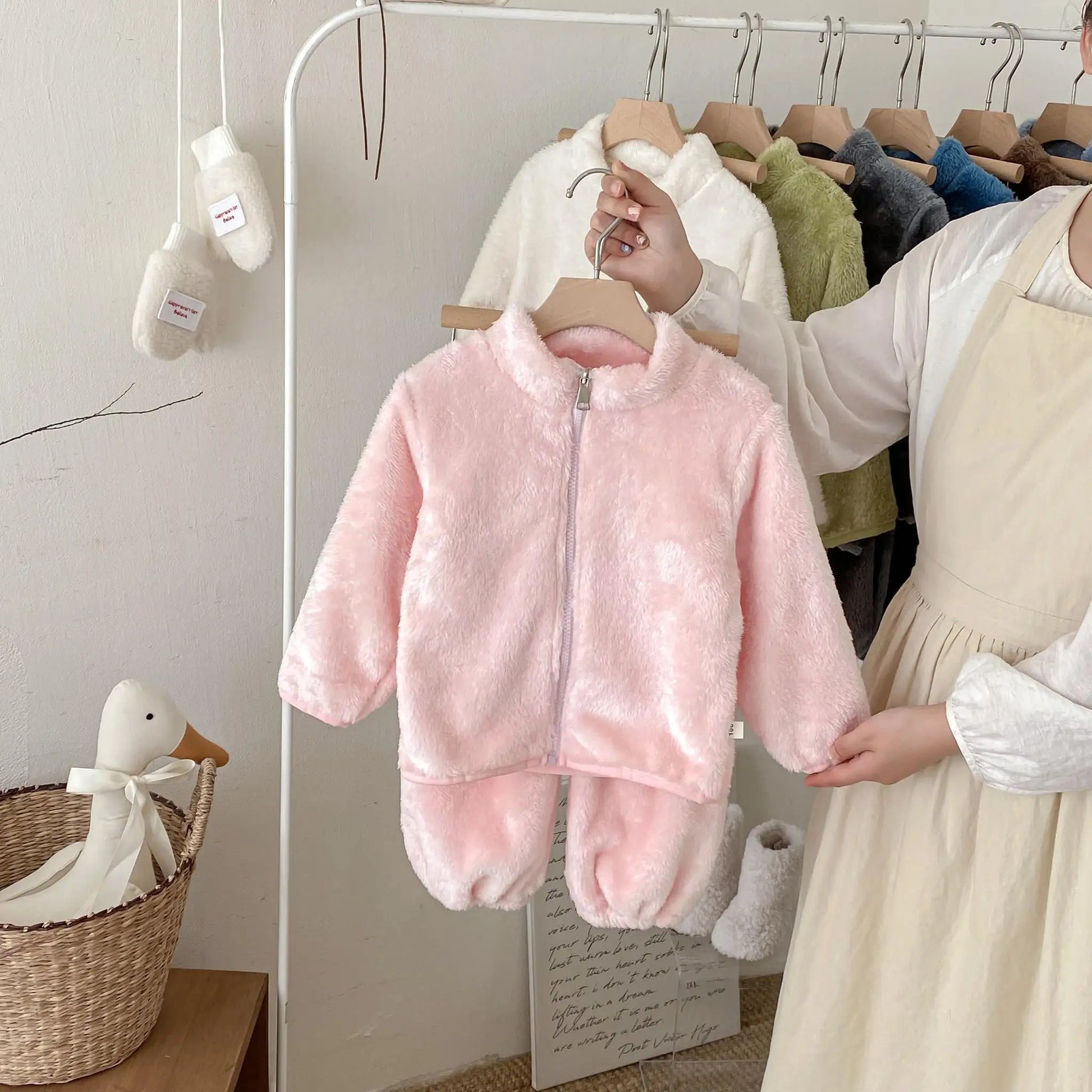 Korean Style Solid Color Baby Fleece Set Winter Soft Loungewear 2Piece Long Sleeve Top + Soft Pants For 9M-6Y Boys Girls Clothes