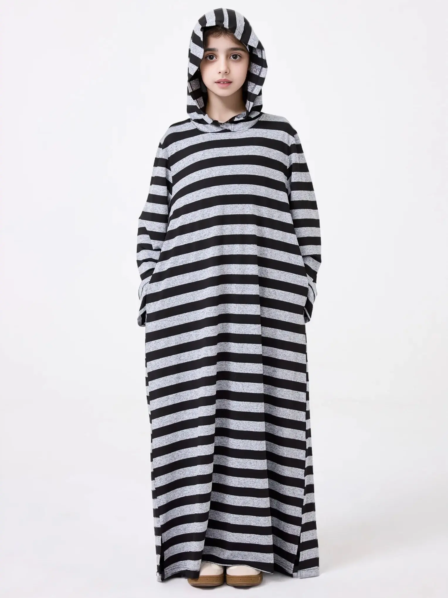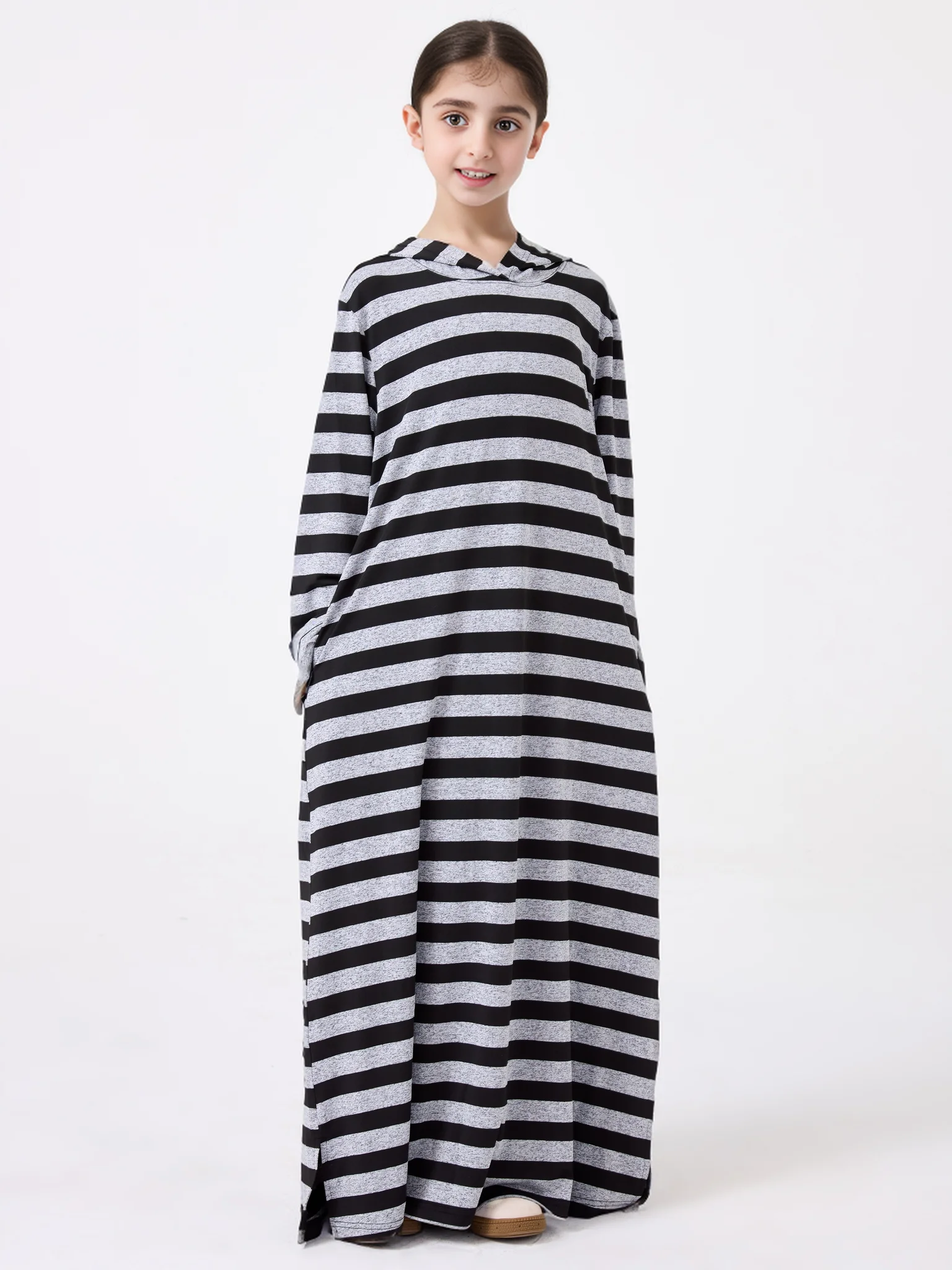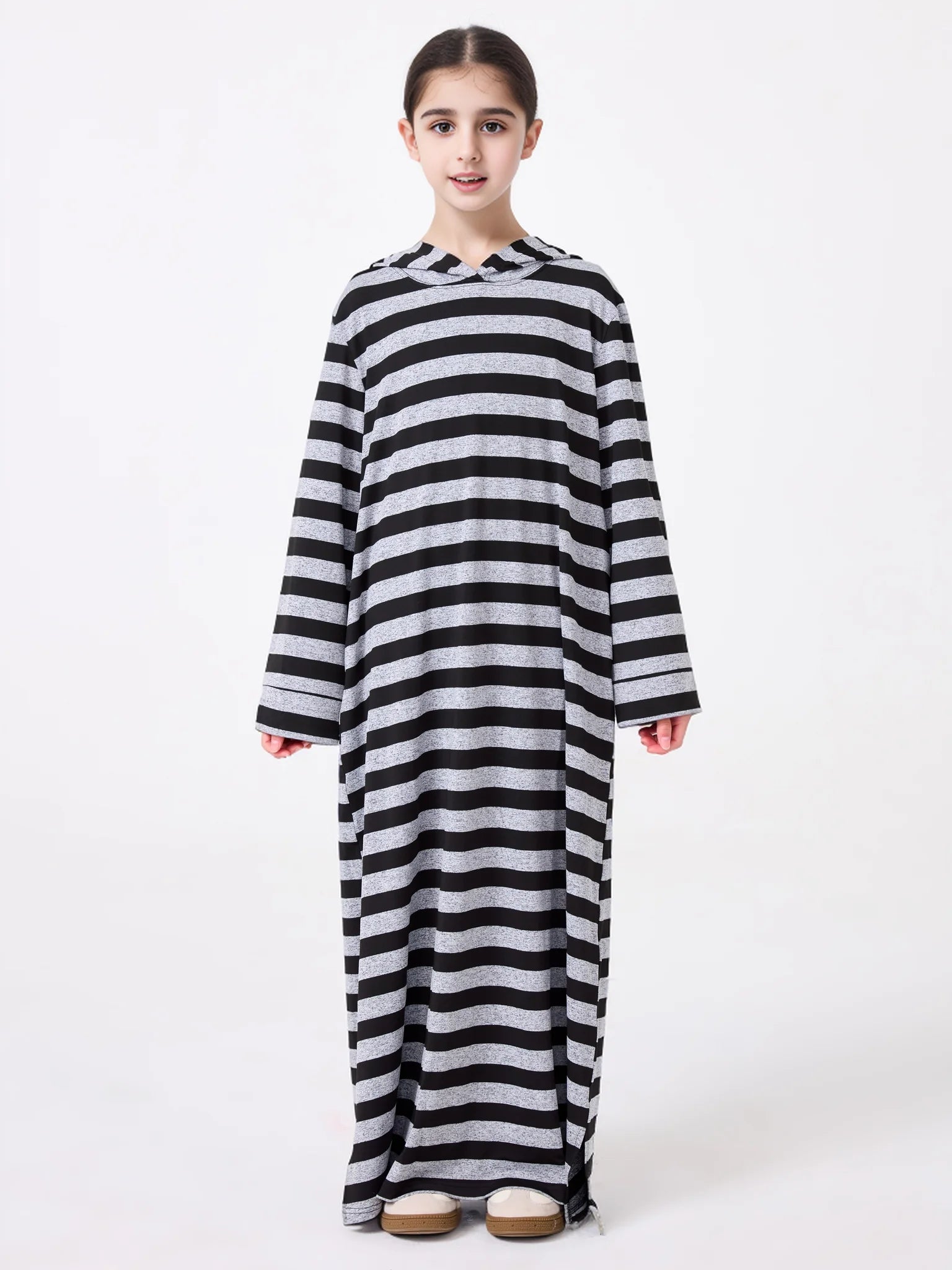 Middle Eastern Muslim Kids Abaya Girl Dress With Striped V-neck Hood