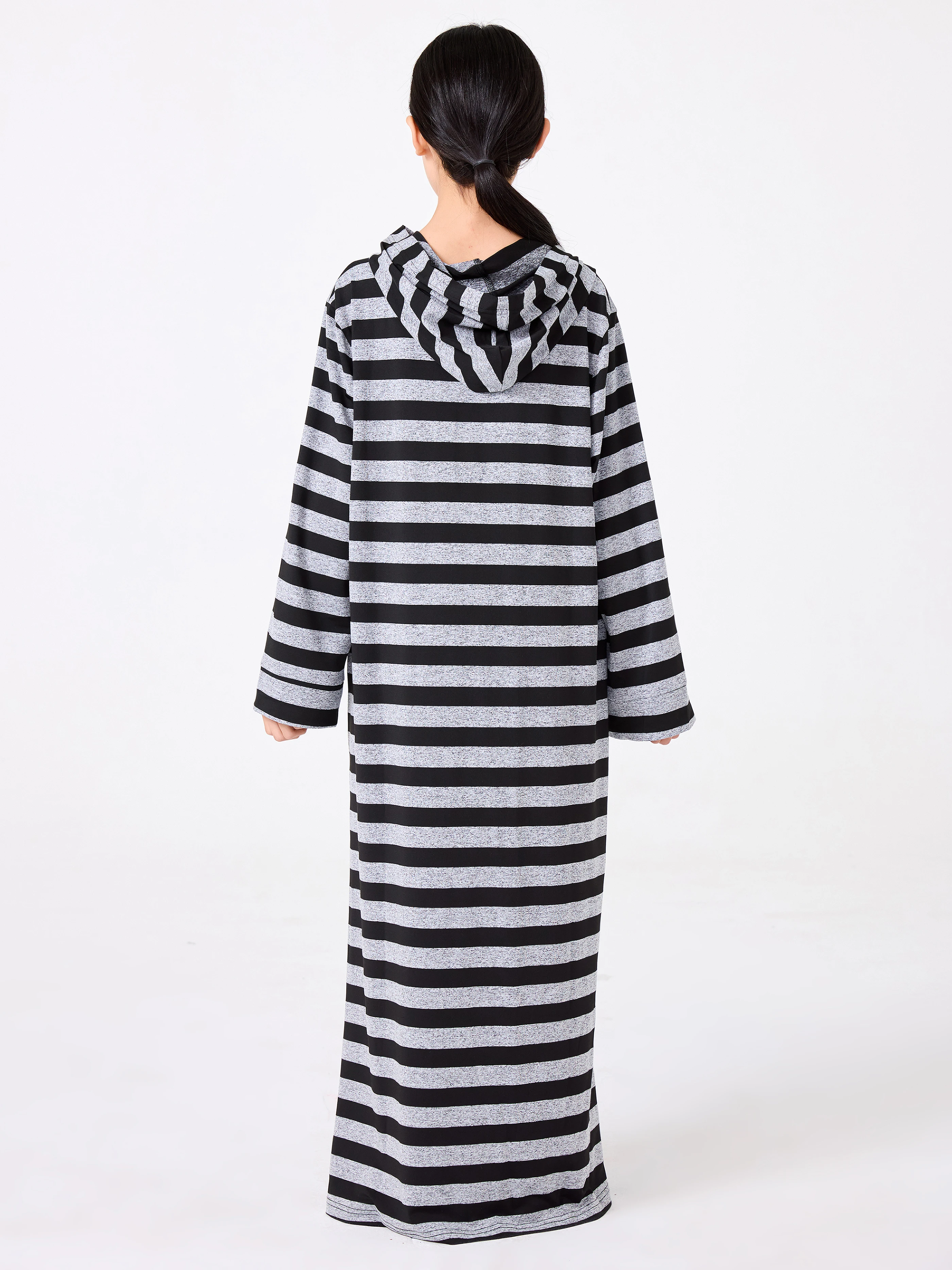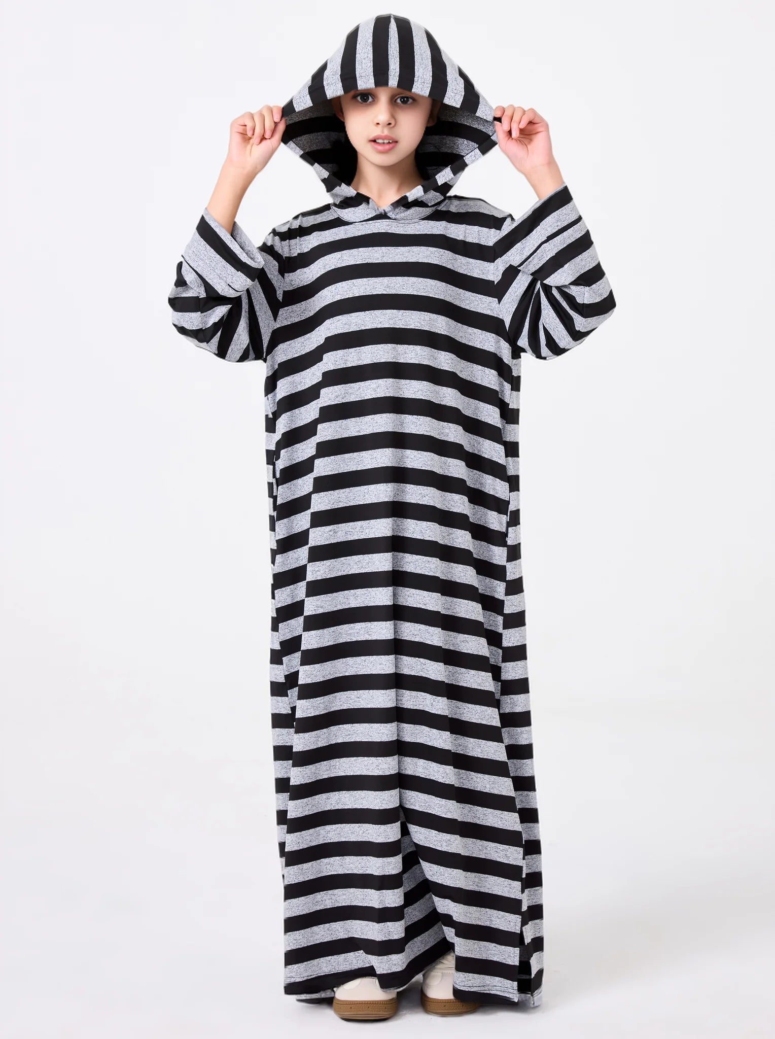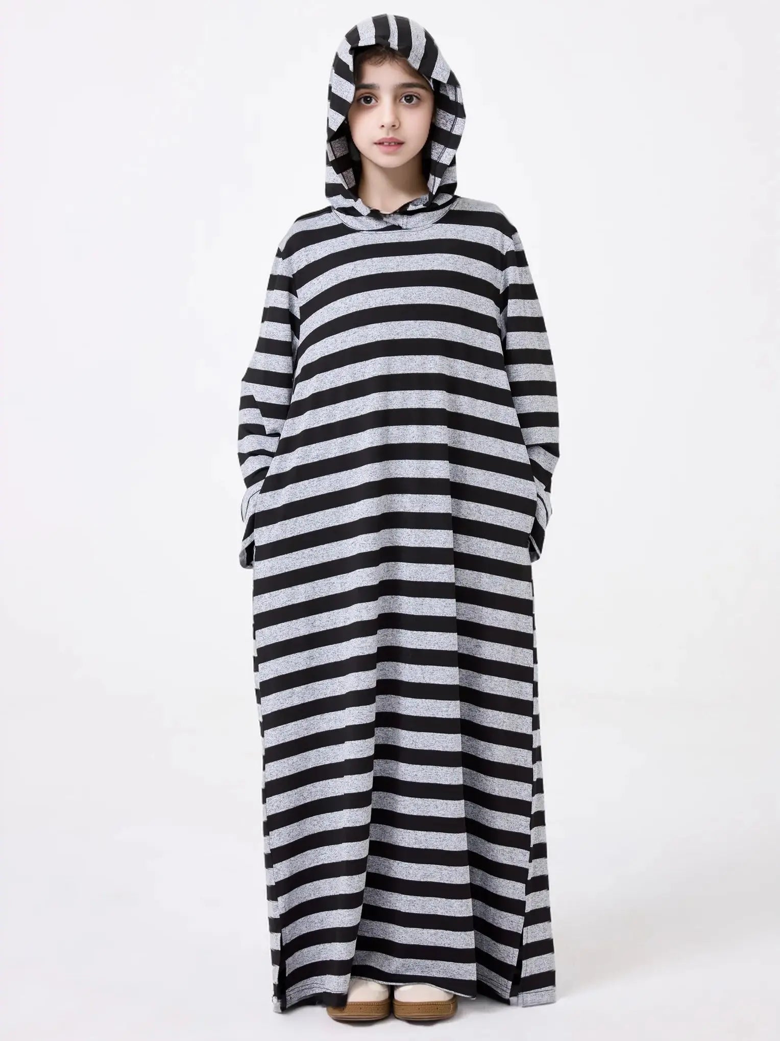 Middle Eastern Muslim Kids Abaya Girl Dress With Striped V-neck Hood
