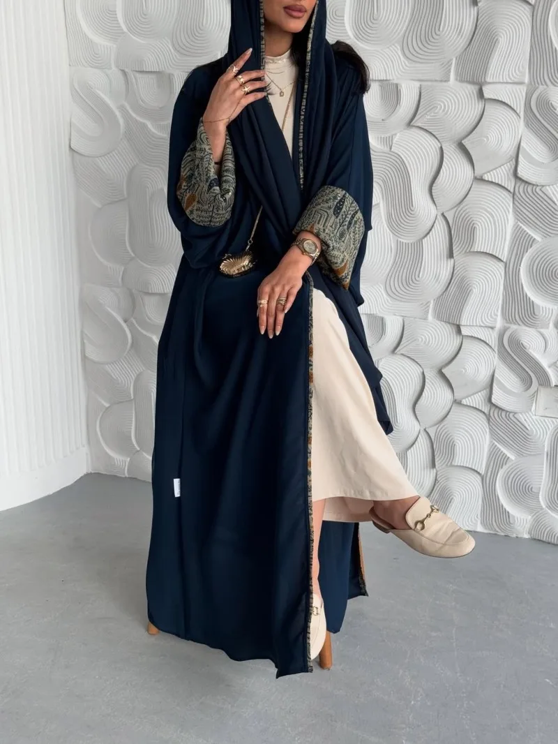 Muslim Women Abayas +Hajib 2pcs Islamic Kaftans Casual Maxi Dresses Arabian Jilbabs Middle Eastern Full Sleeve Open Front Abaya