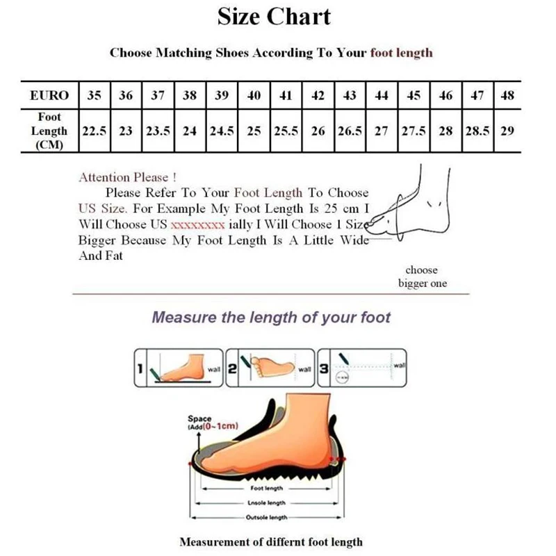 1. Choose the size according to your foot length (don't choose the size according to the usual size in your country!!!)