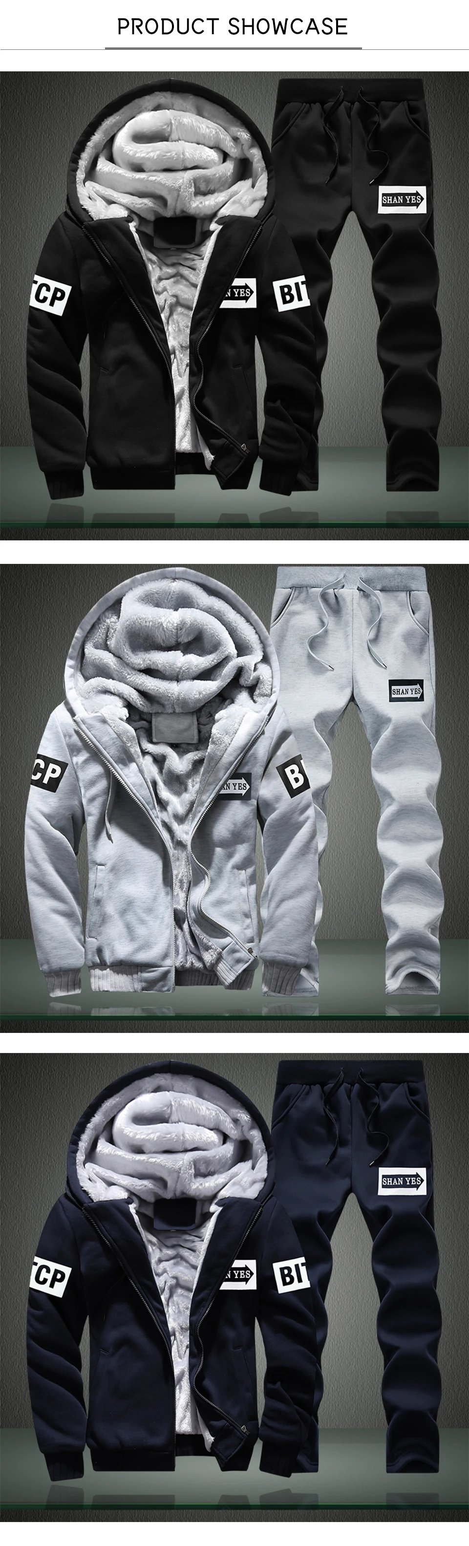 New Fleece Men Set Fashion Brand Tracksuit Lined Thick Sweatshirt + Pants Sportswear Suit Male Winter Warm Hooded Outerwear Suit
