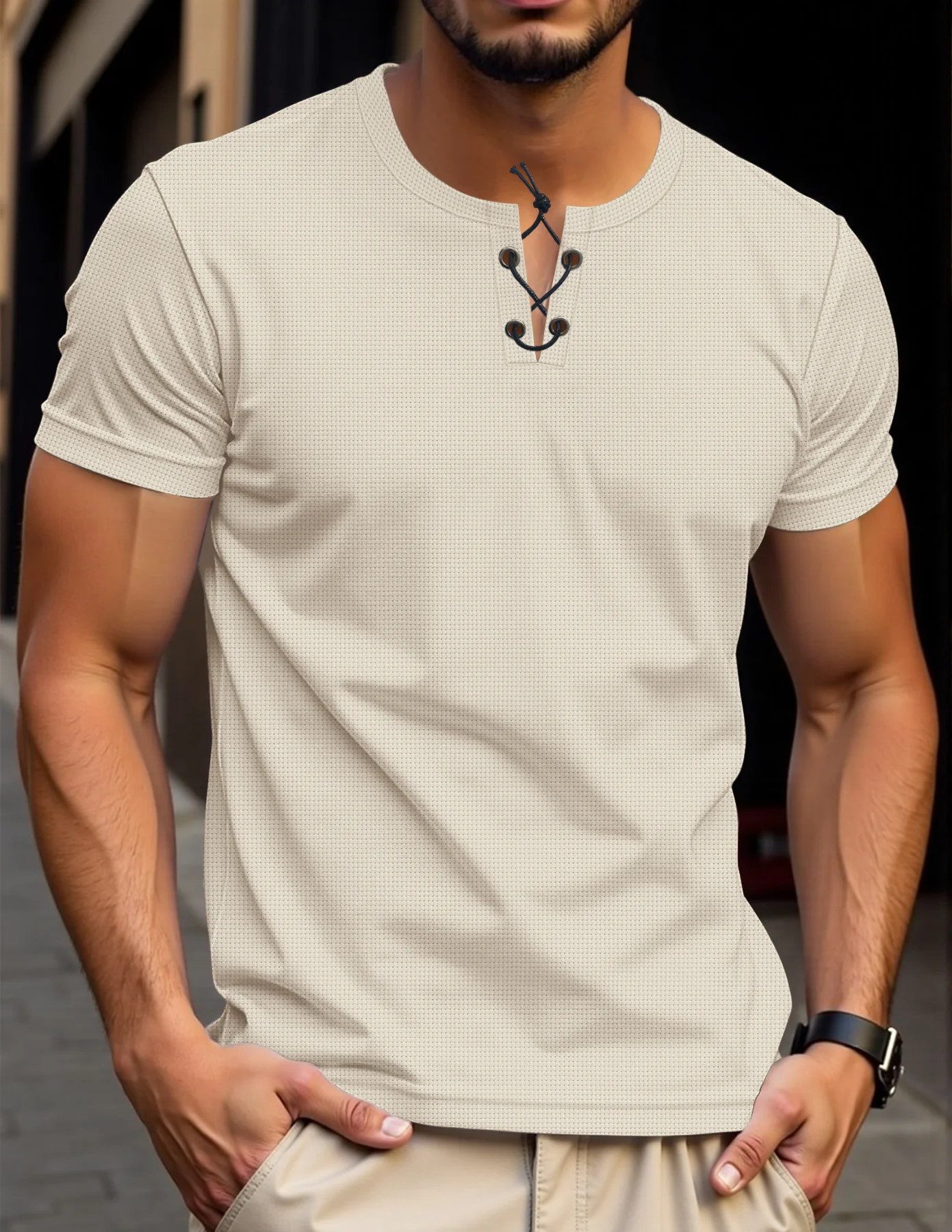 New Spring/Summer Men's Casual Waffle Solid Color Round Neck Tie Rope Short Sleeve Hoodie Top Outdoor Versatile Fashion Top