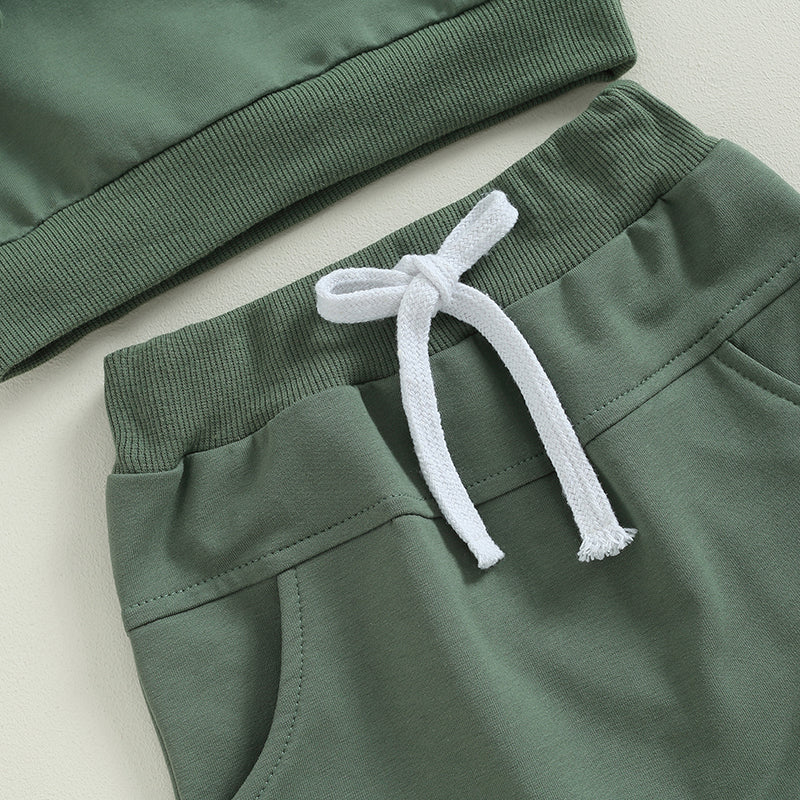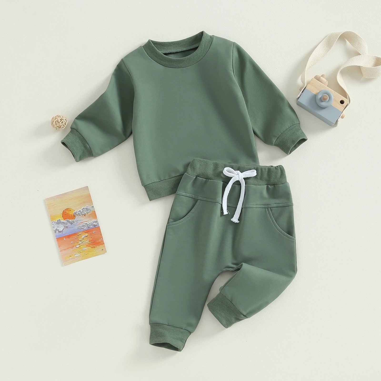 Solid color, baby sweatshirt, crew neck, long sleeves. Baby pants with pockets and elastic waist. Simple yet stylish, with a unisex design, your little one will receive lots of compliments when wearing it.