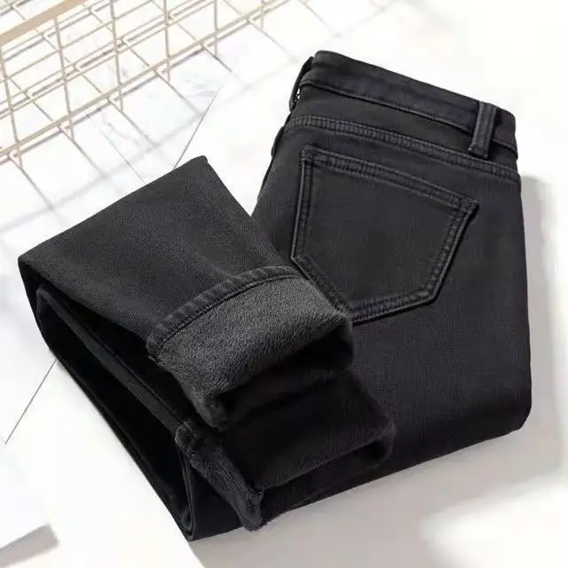 Slimming Fleece Lined Harajuku Style Women's Jeans High Waist Skinny Casual Thickened Cotton Denim Pants Korean Fashion