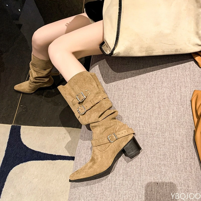 Spring and Autumn Fashion New Pointed Cowboy Coarse Heel Stacked Boots New Style No Knee Large Barrel Giroud Women's Boots