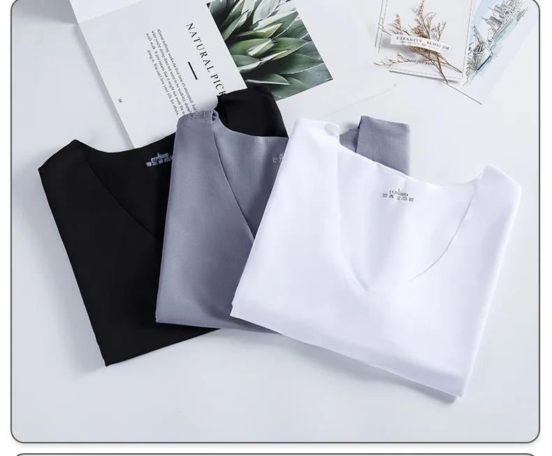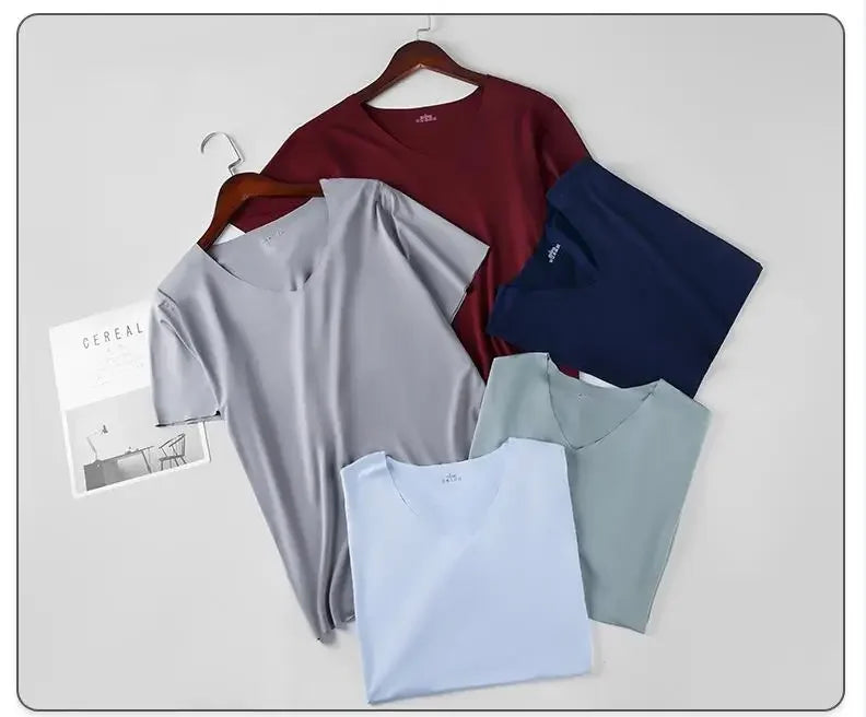 Summer Seamless Breathable Ice Silk T-Shirt Vest Men's Sports Short Sleeve T-shirt Solid Color V-neck Tees Quick Dry Shirt Tops