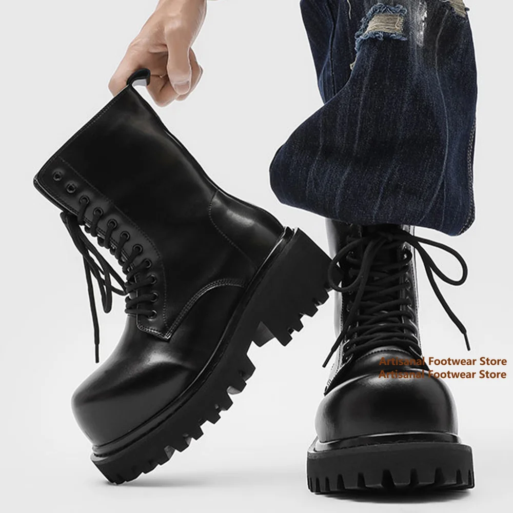 Thick-Soled Motorcycle Boots Retro Big Round Toe Men's Boots Classic Height Increasing Outdoor Designer Handmade Men Boots