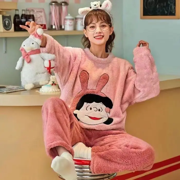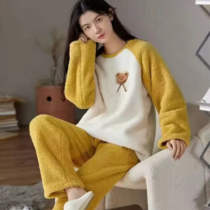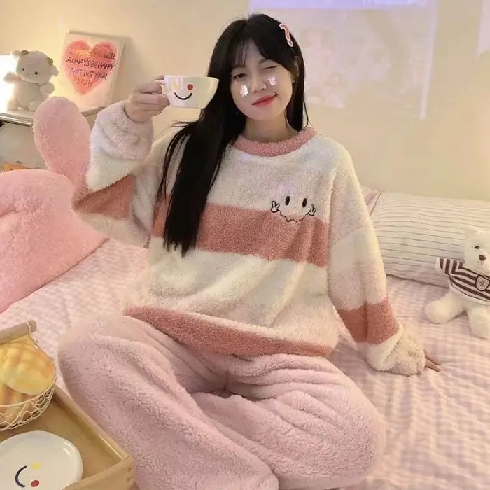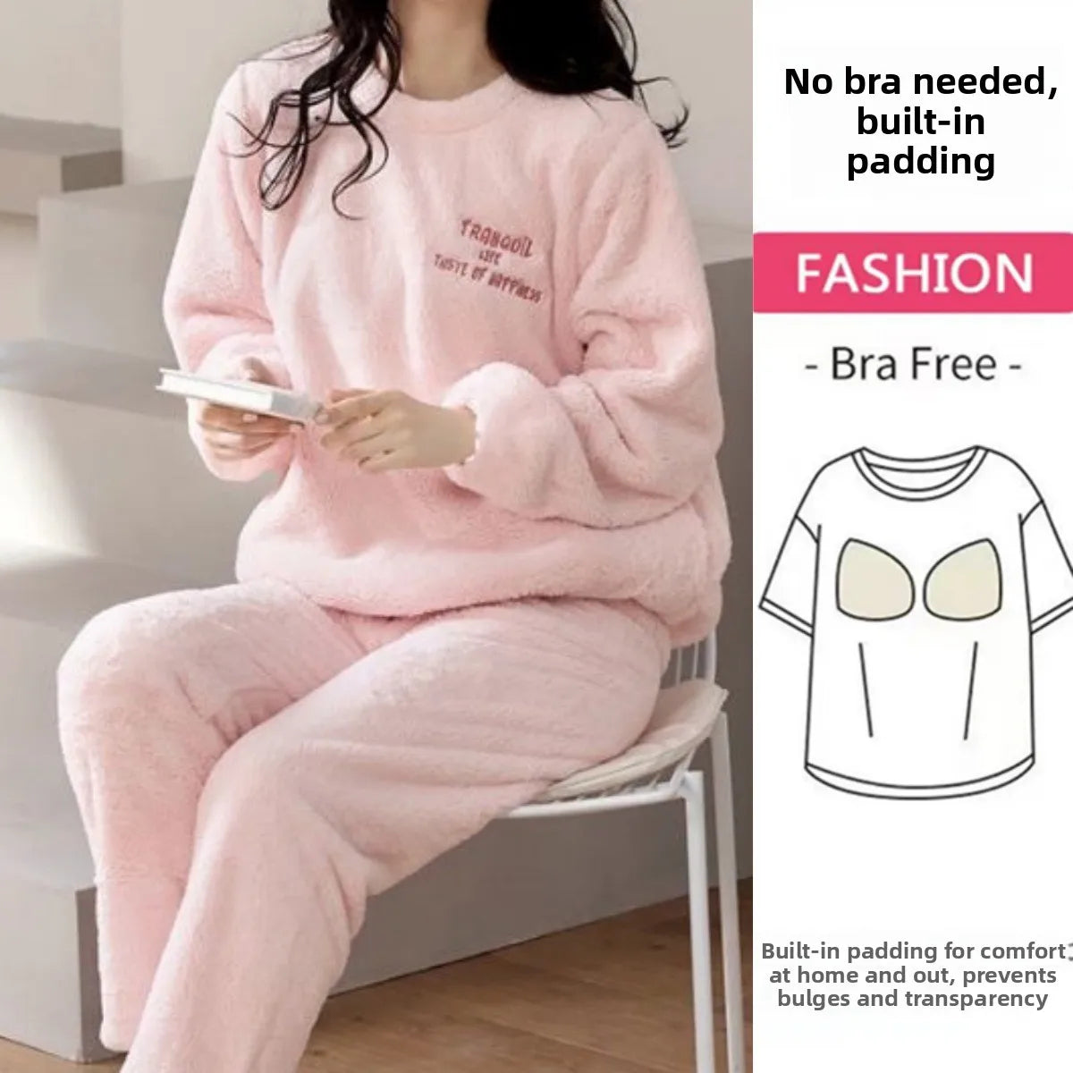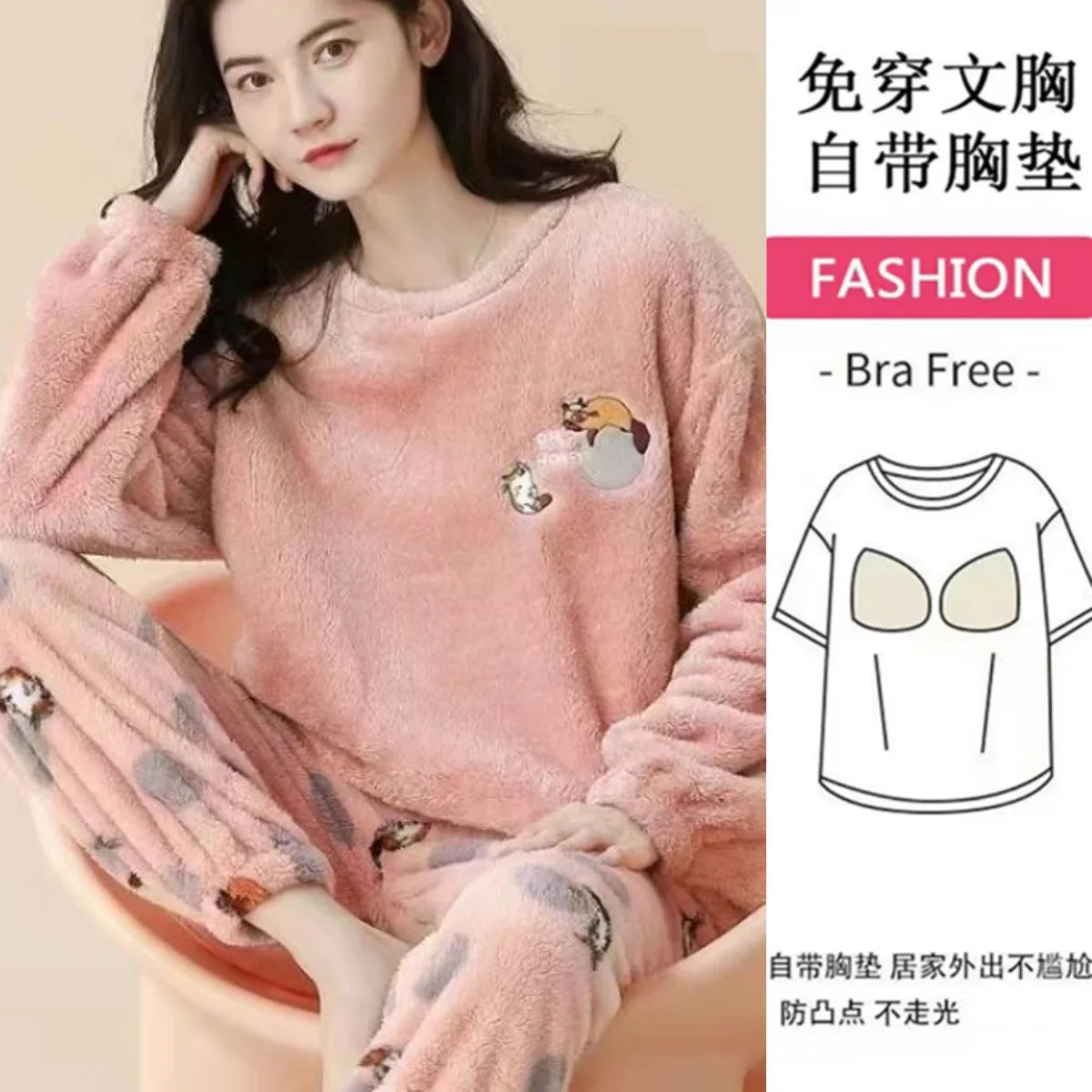 Thickened Long Sleeve Home Clothes Set with Chest Pad Winter Coral Fleece Korean Style Student Cute Large Size Home Clothes Set