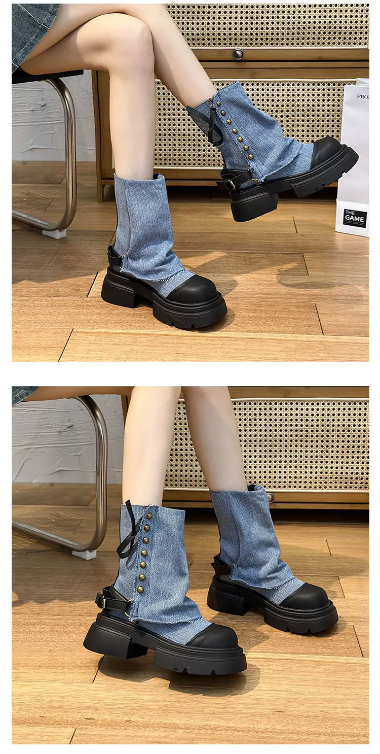 Women Boots British Fashion Pants Leg Boots New Thick Soled Rivet Zipper Belt Buckle Platform Anti Slip Cowboy Short Boots