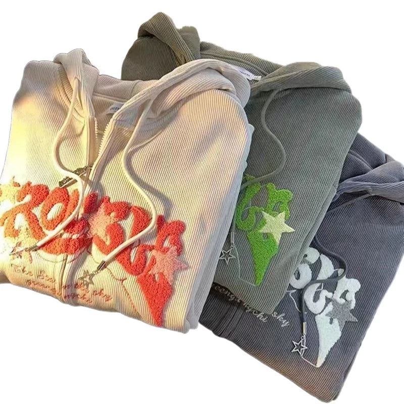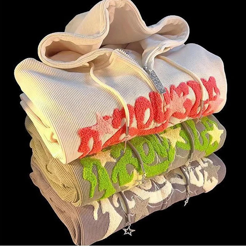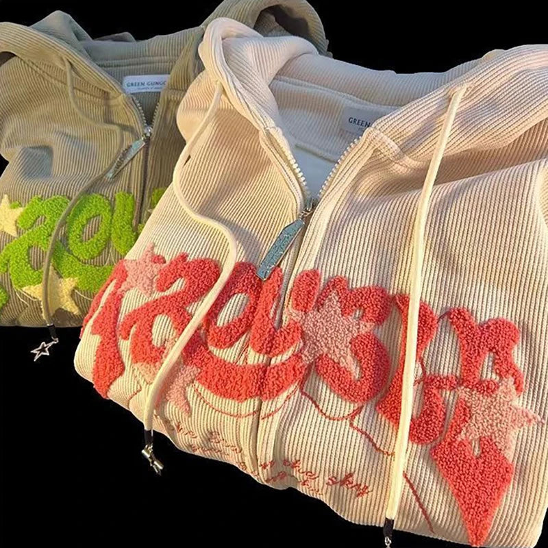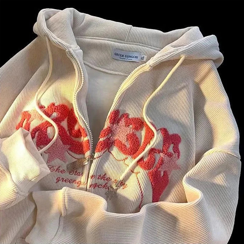 Women Retro Embroidery Hoodies Autumn Winter Zip Up Long Sleeve Loose Jacket Coats Y2K Casual Pocket Hooded Sweatshirts