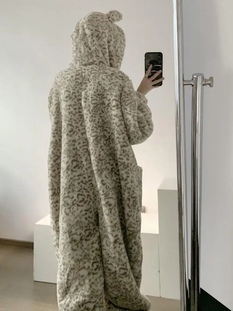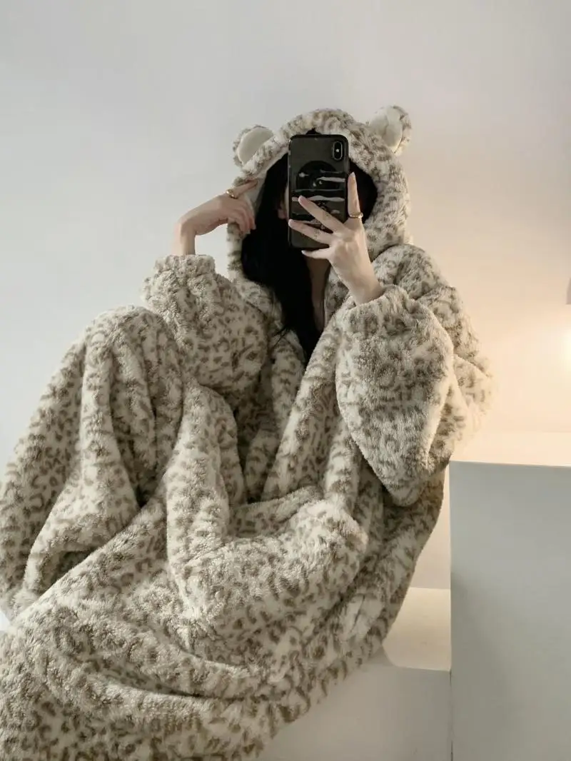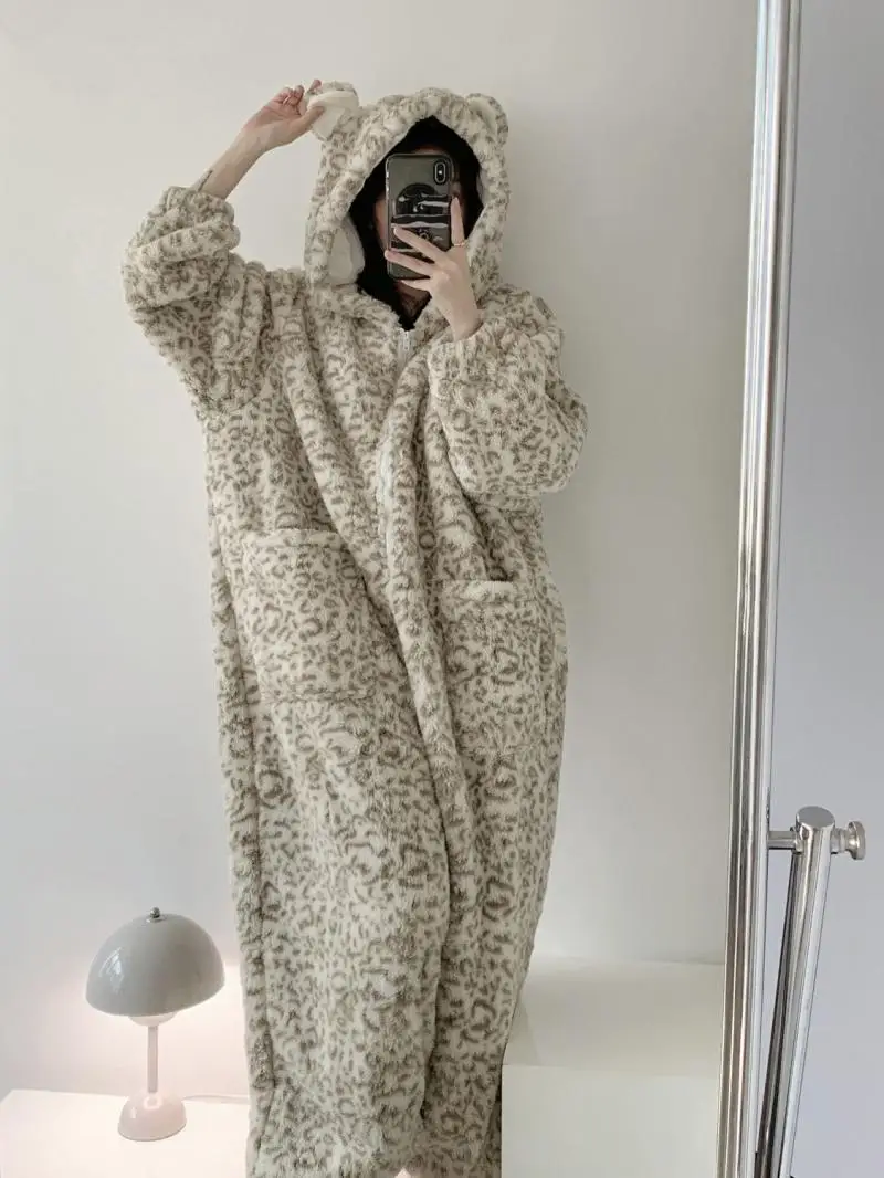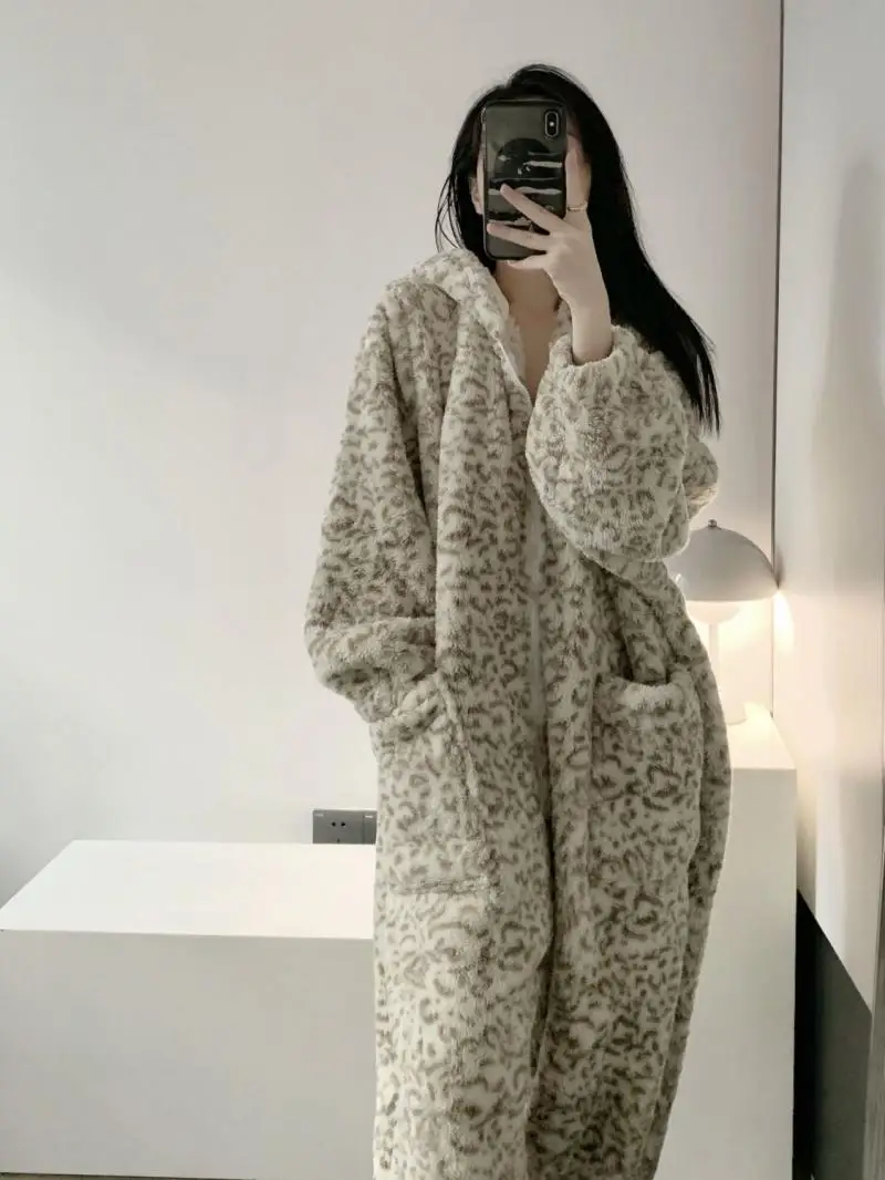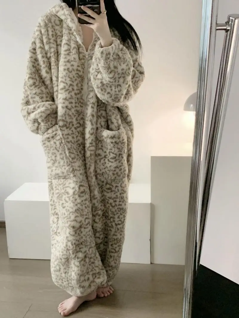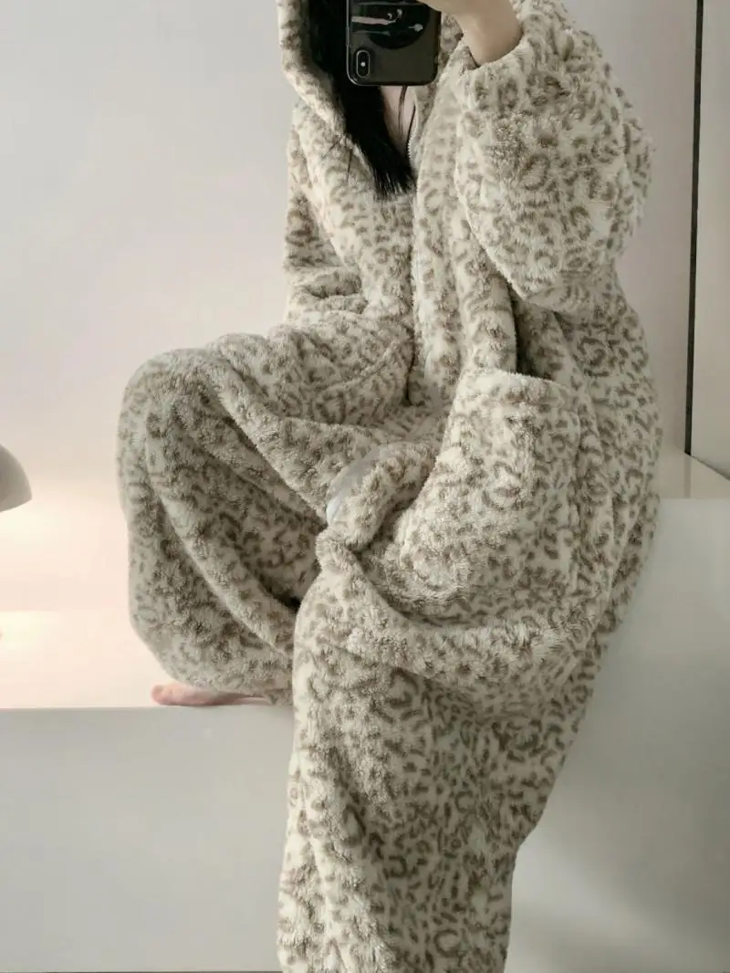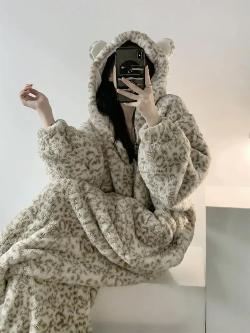 Women's Clothing Winter Pajamas Hooded Fleece-Lined Thicken Ins Wind Coral Fleece Plus Size Homewear Keep Warm Comfortable