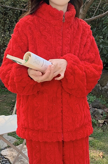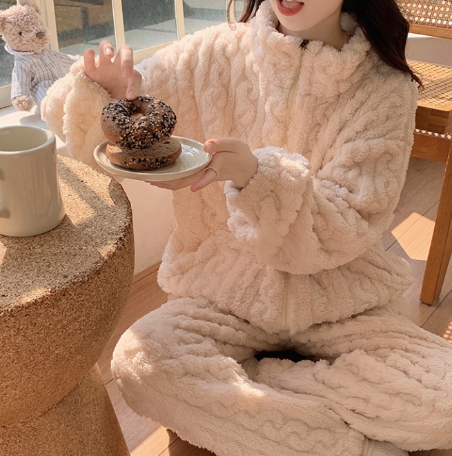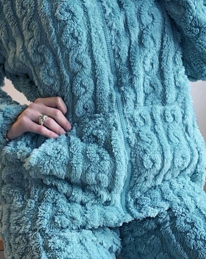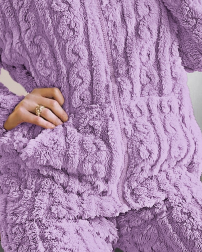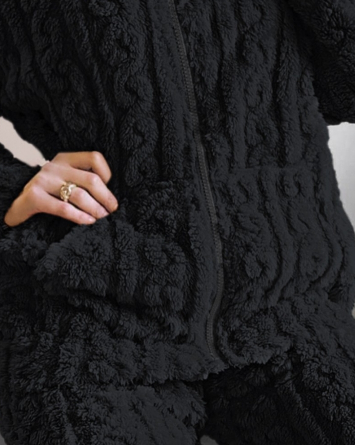 Women's Winter 2 piece sets women outfit Coral fleece pajamas home set Stand Collar Zip Up Fuzzy Teddy Top high waisted Pant Set